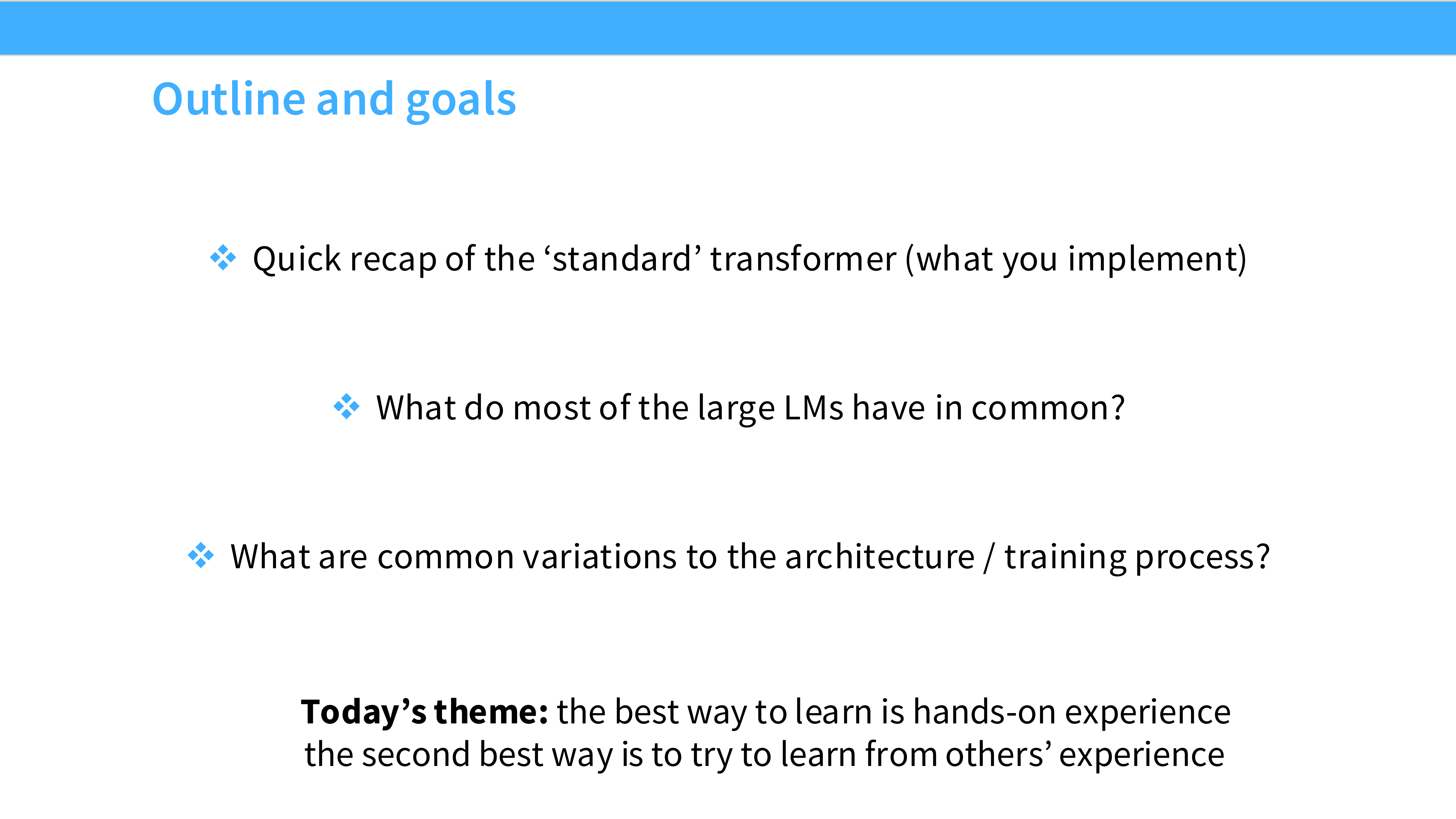 - 核心: “Today’s theme: the best way to learn is hands-on experience… try to learn from others.”(从前人的实验中总结最佳实践)。
