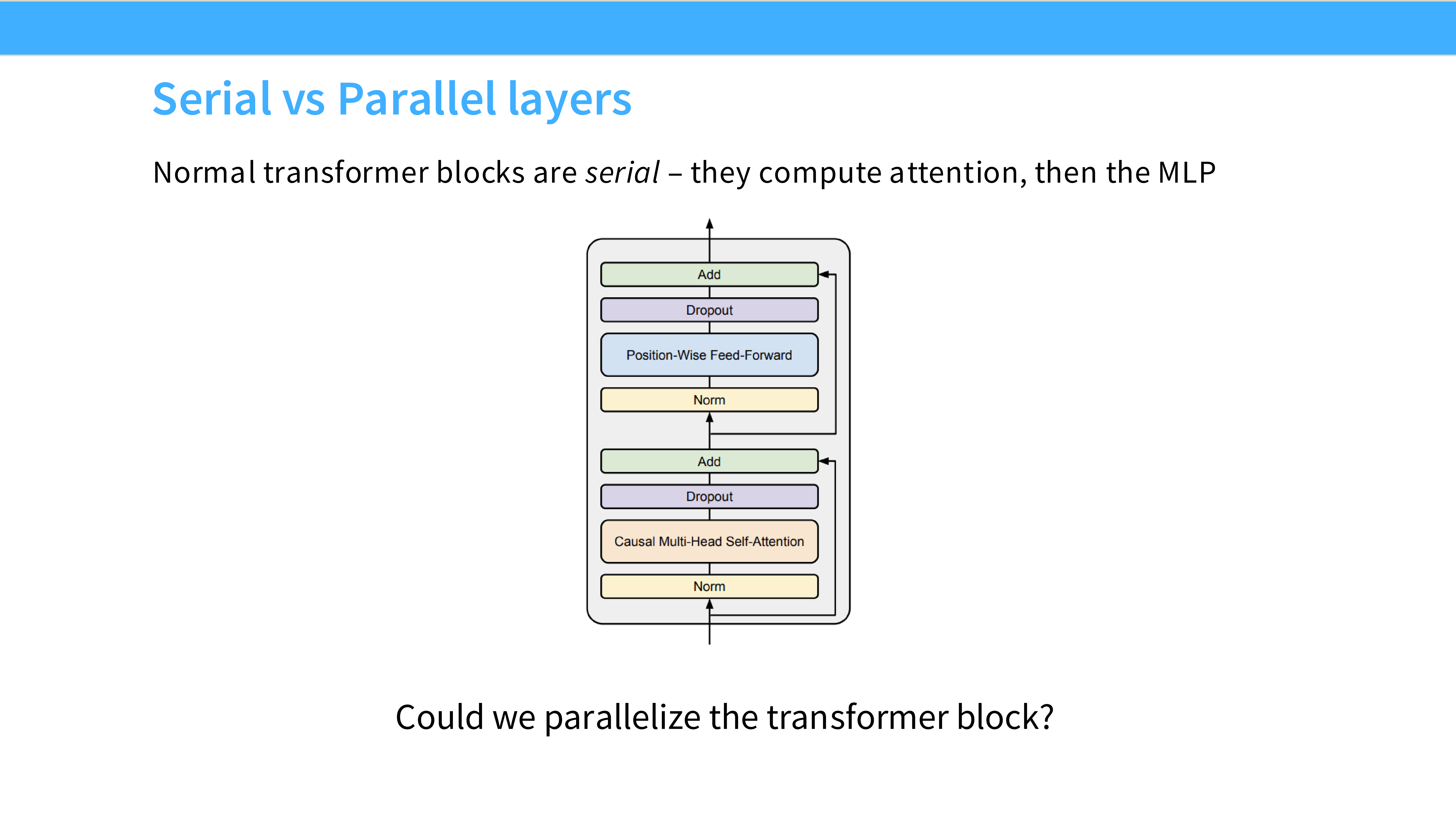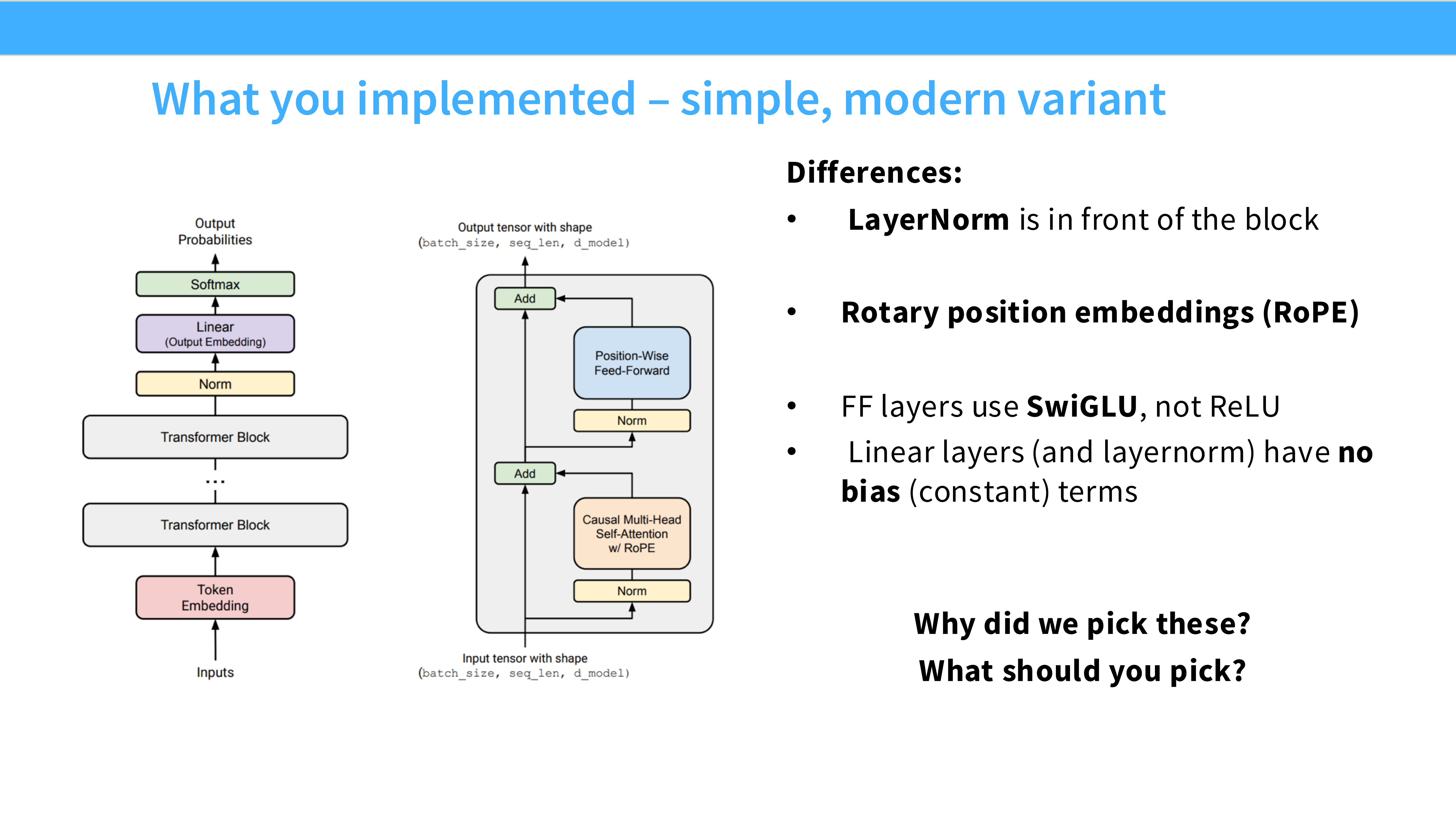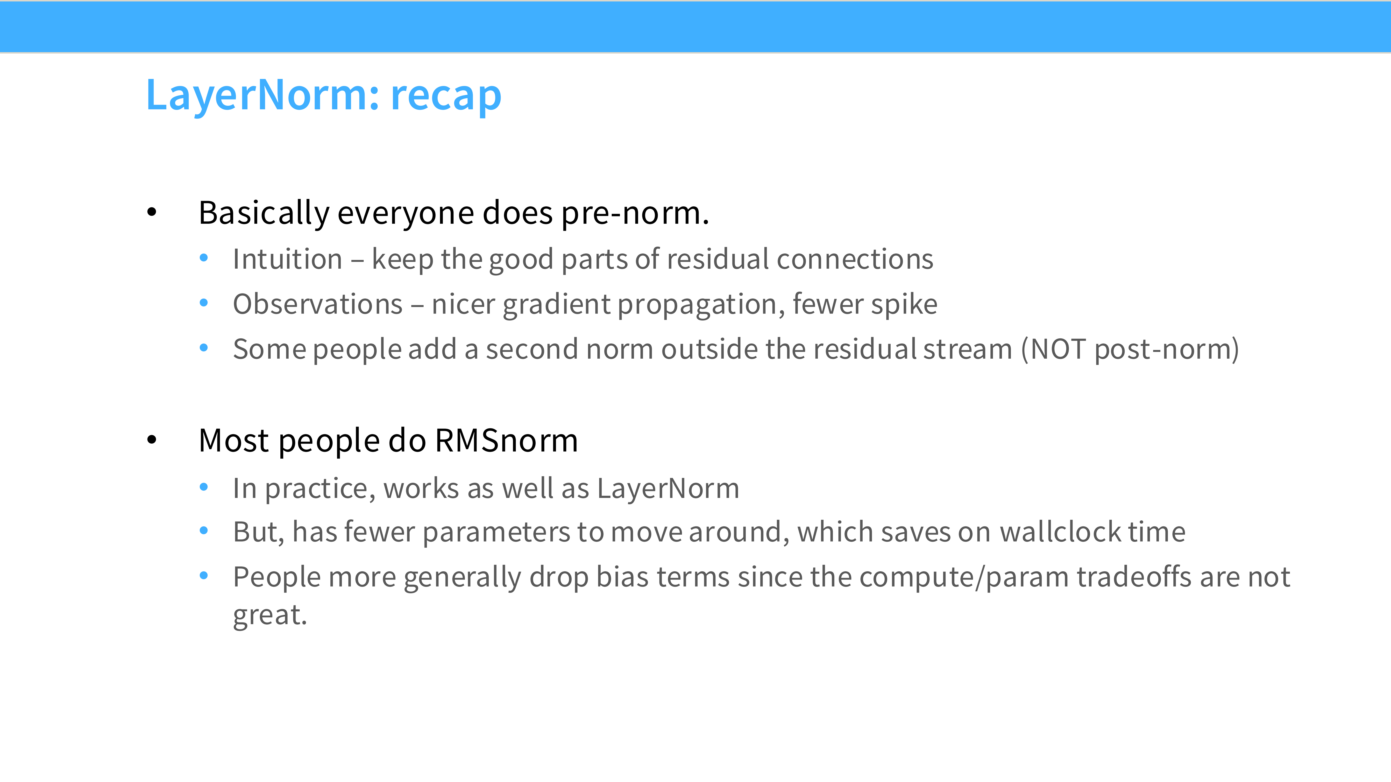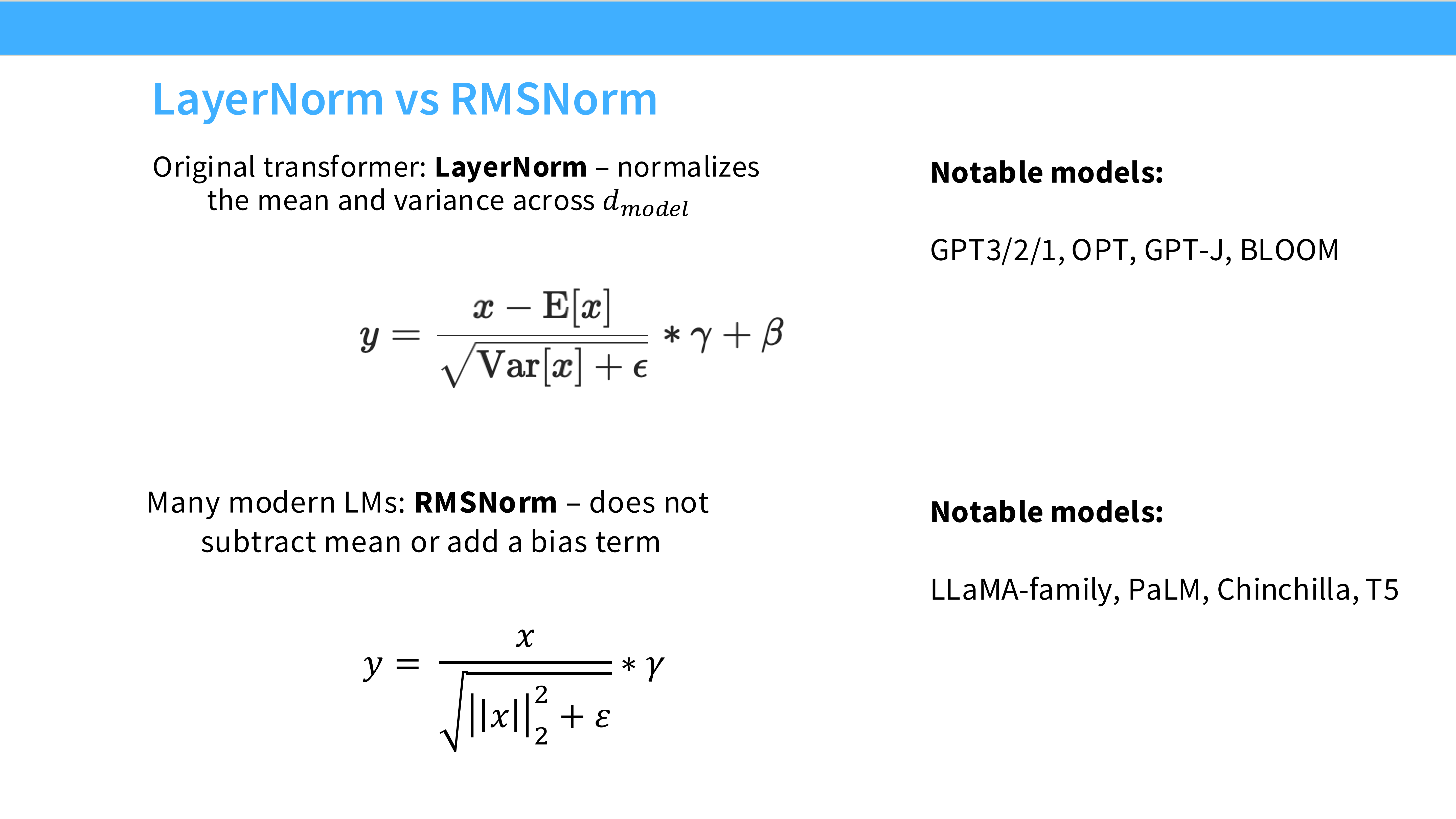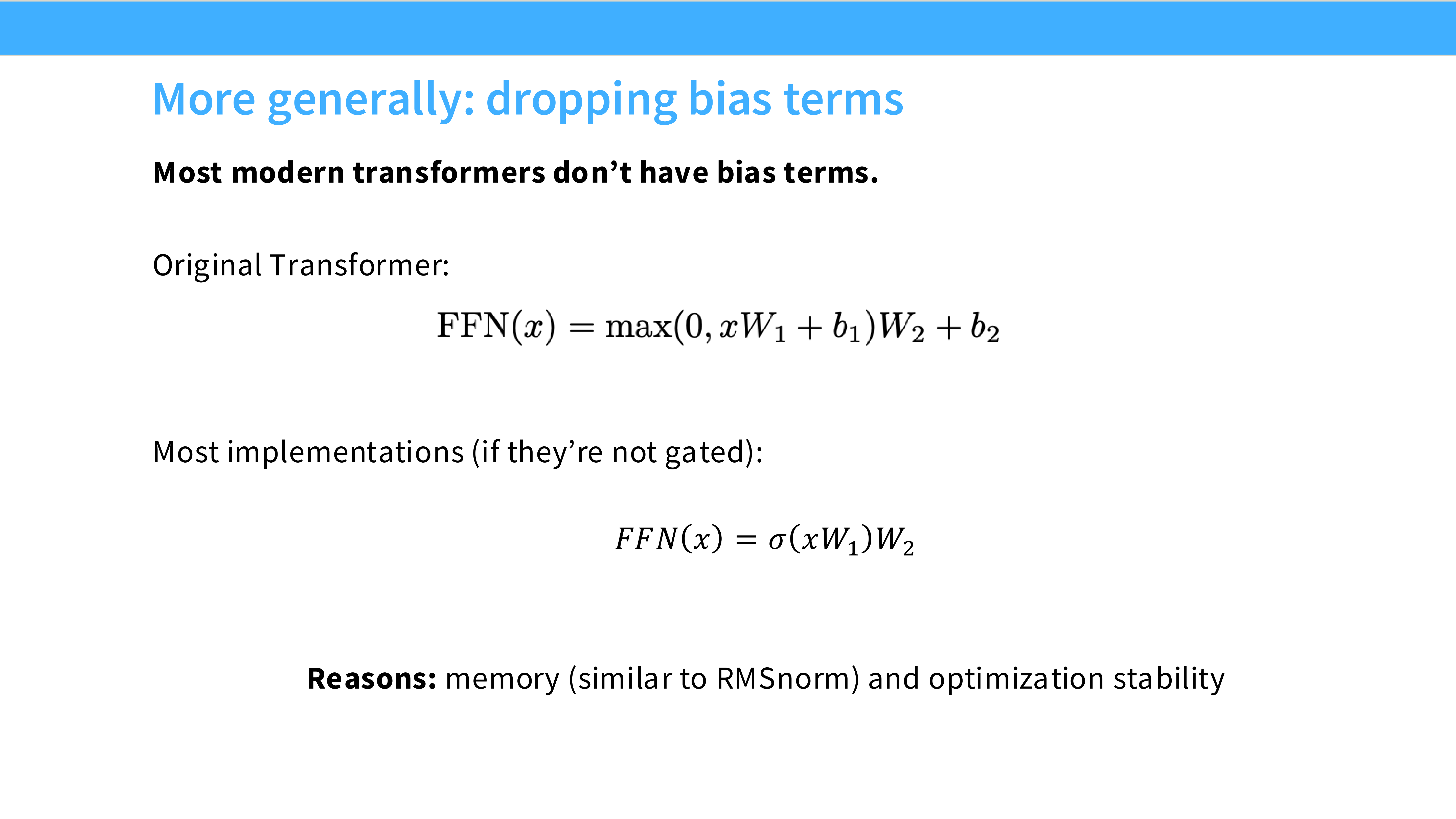 - 内容: 许多现代模型(PaLM, Llama)移除了所有 Linear 层和 Norm 层的 Bias 参数。
