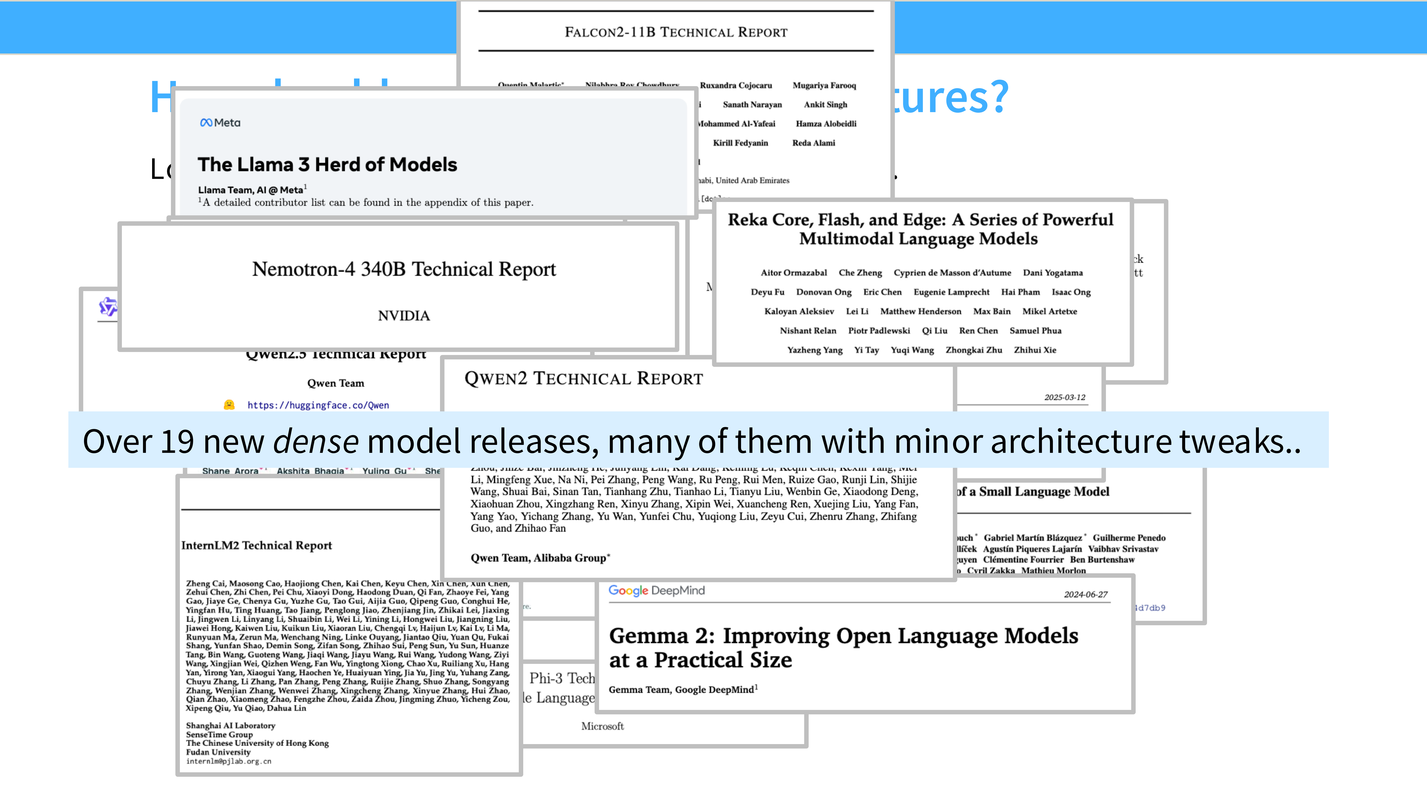 - 内容: 列举了近年来发布的各种模型(Llama 3, Nemotron, Qwen 1.5, Gemma 等)。