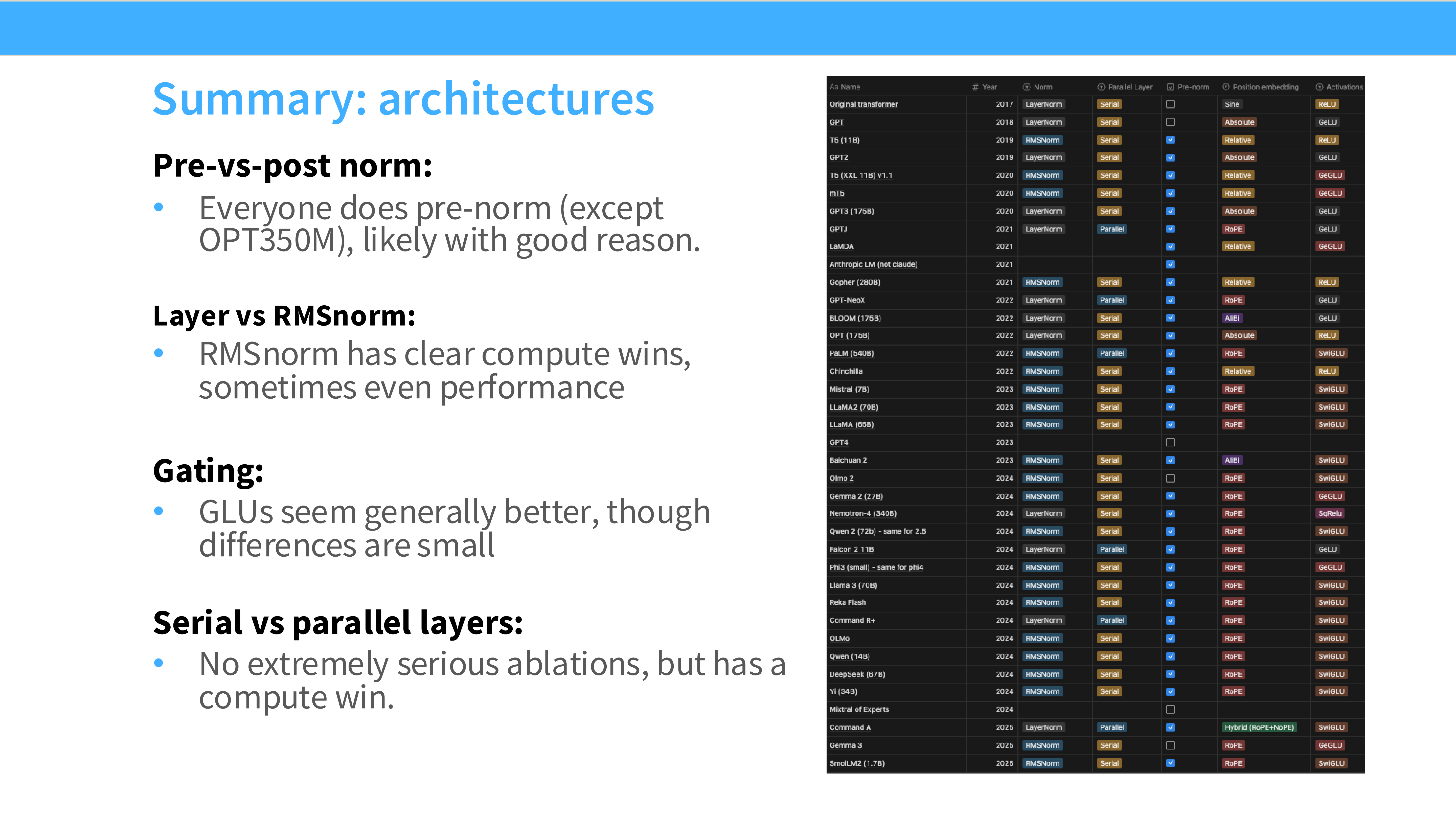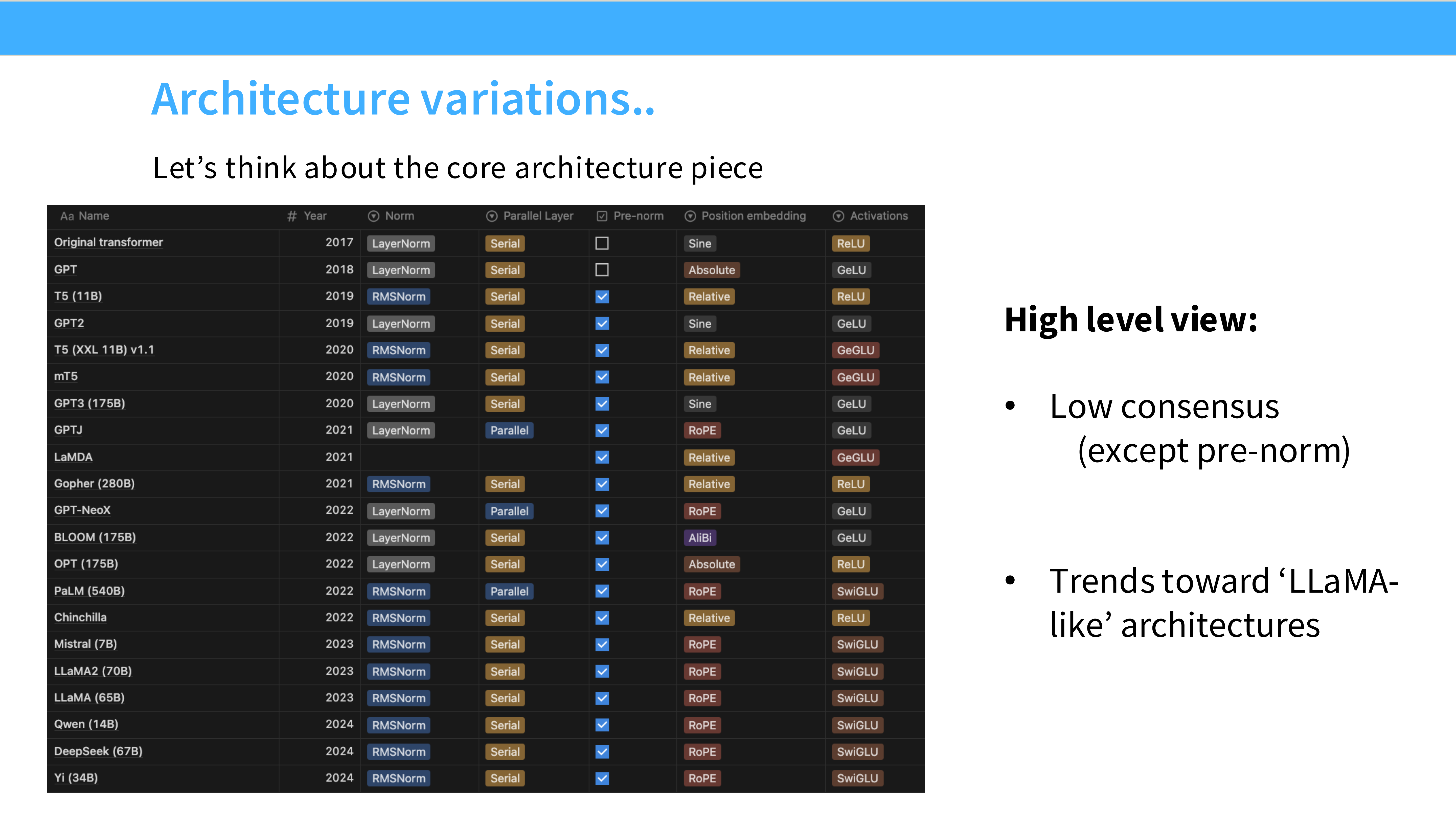 - 趋势: 可以明显看到从早期的混乱(各种尝试)到后期的统一(Pre-norm, RoPE, SwiGLU 占主导)。