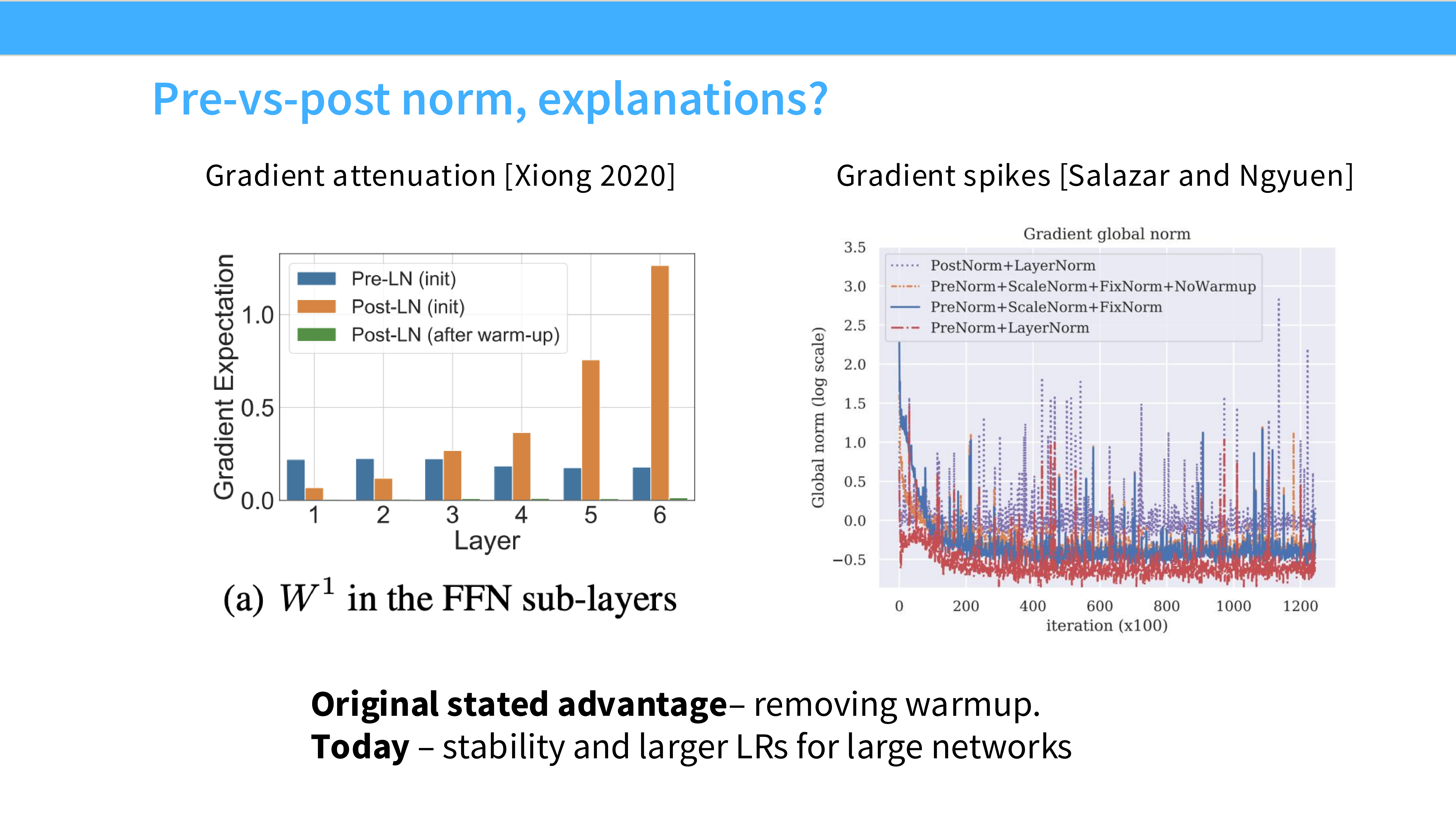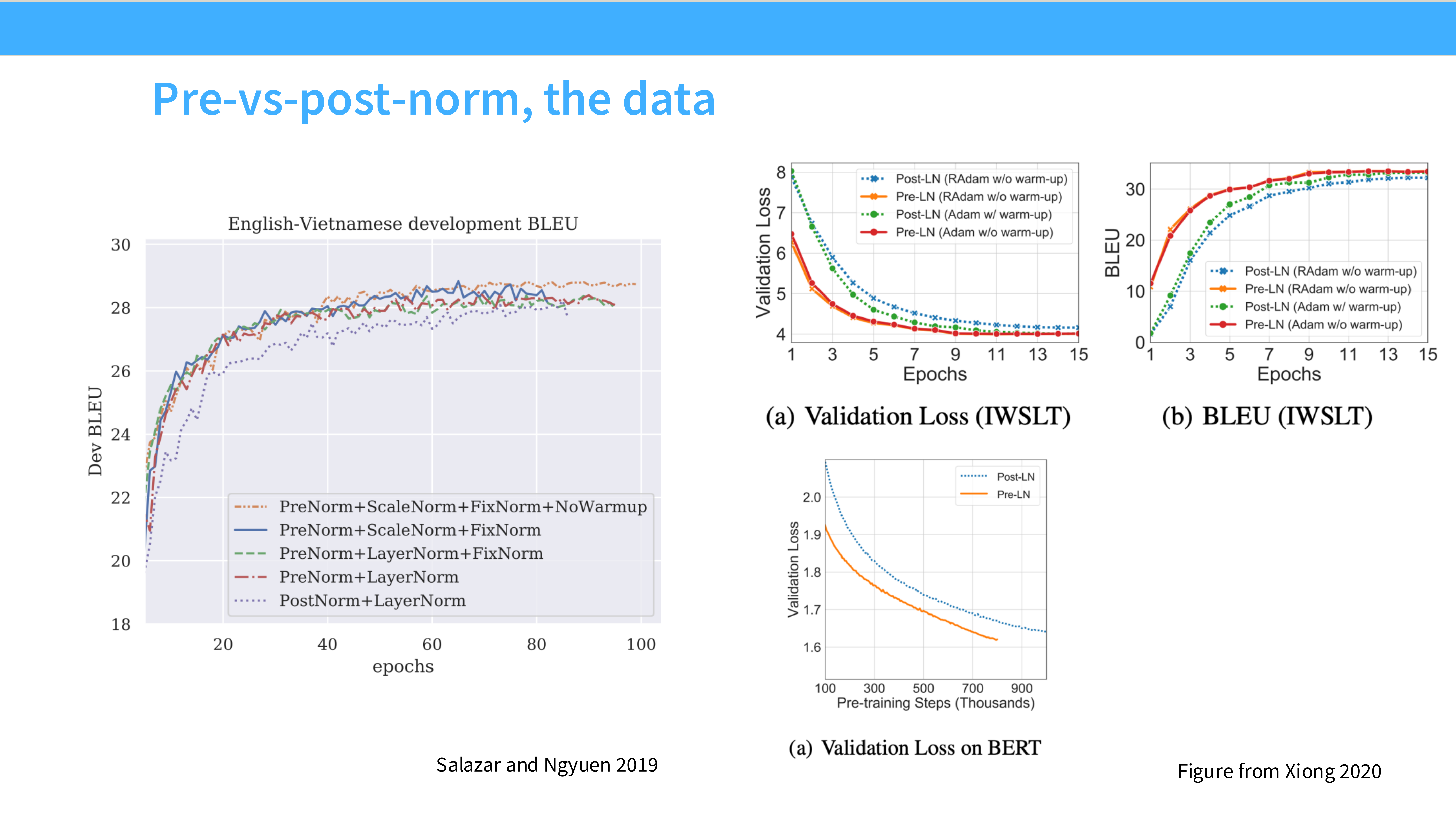 - 结论: Post-LN(蓝线)如果没有精心设计的 Warmup 很容易炸或者是收敛慢;Pre-LN(红/绿线)则非常稳健,收敛更快。