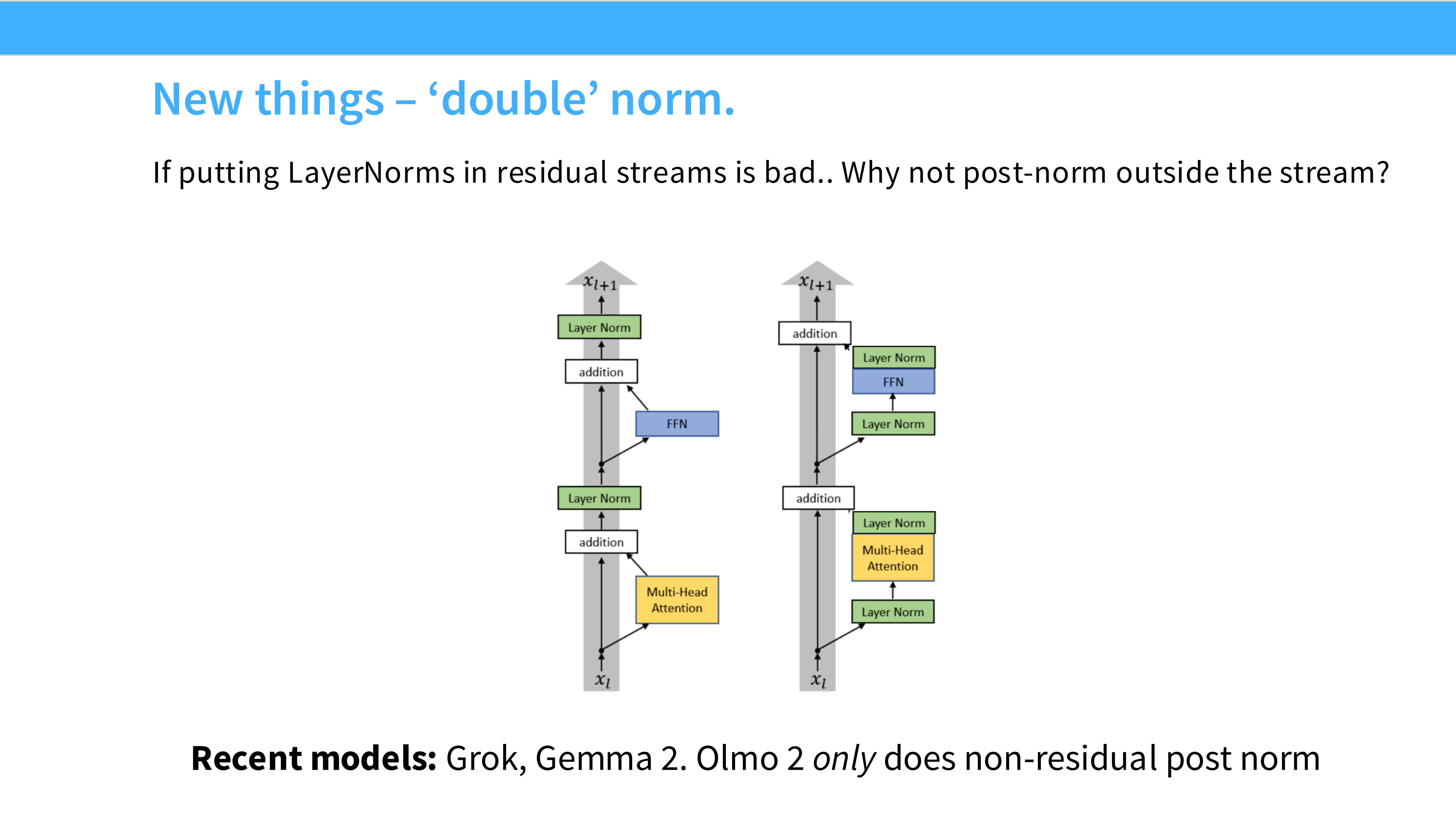 - 做法: 它们在 Pre-Norm 的基础上,又在残差块的输出位置加了一个 Norm。这是一种“双保险”,为了在大规模训练时获得极致的稳定性。