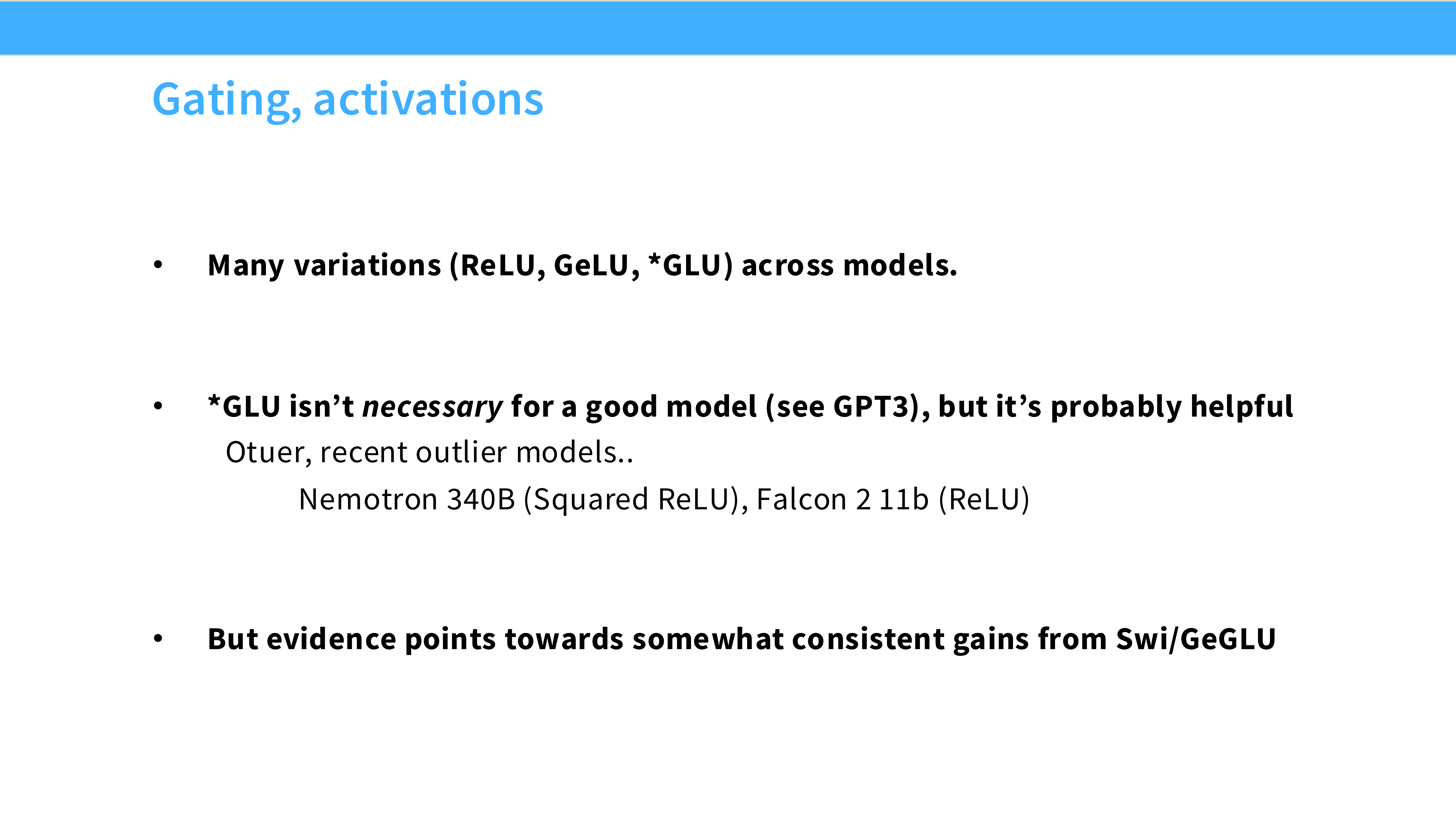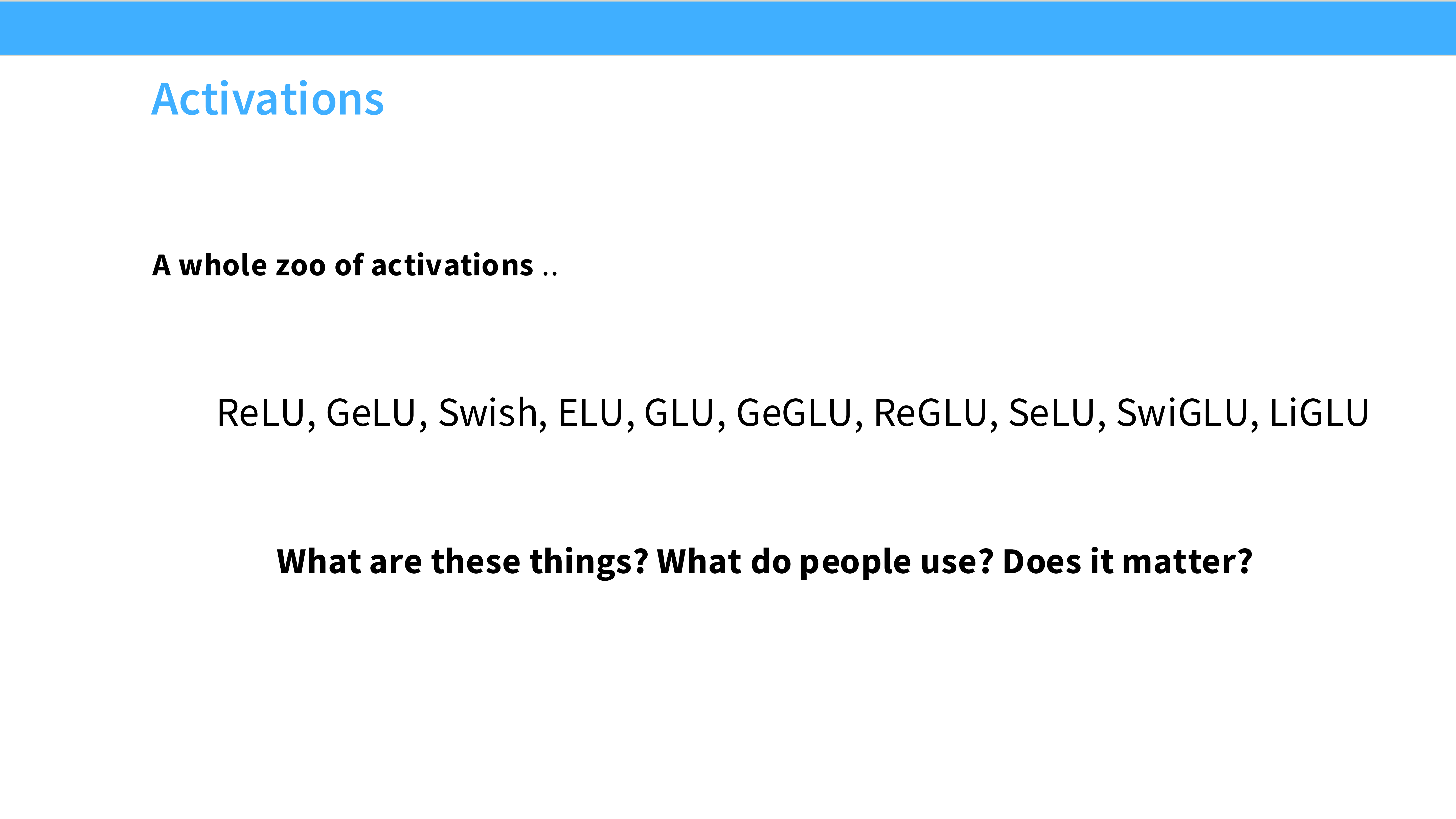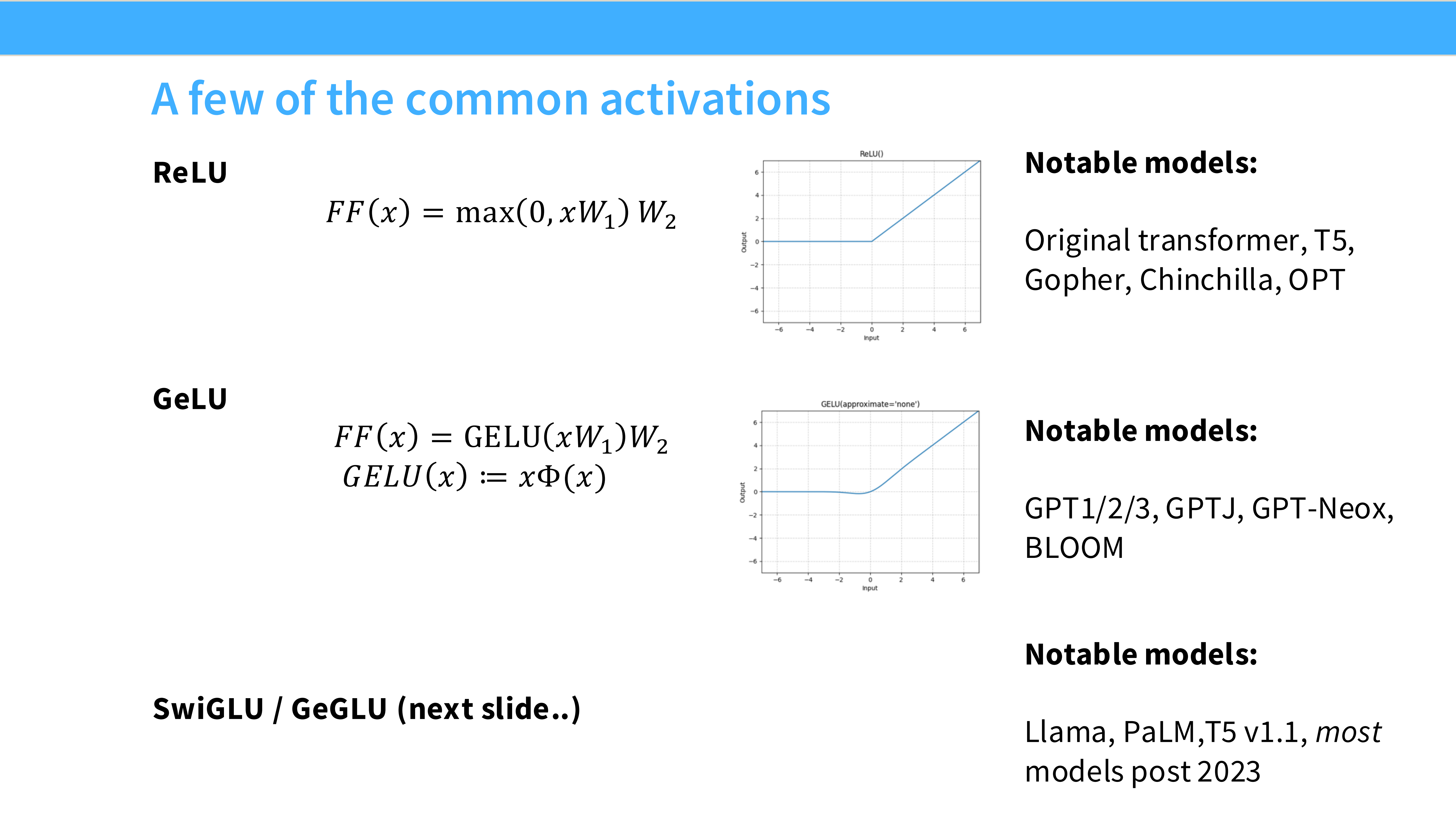 - 内容: 标题页。我们将看到从 ReLU 到 SwiGLU 的演进。