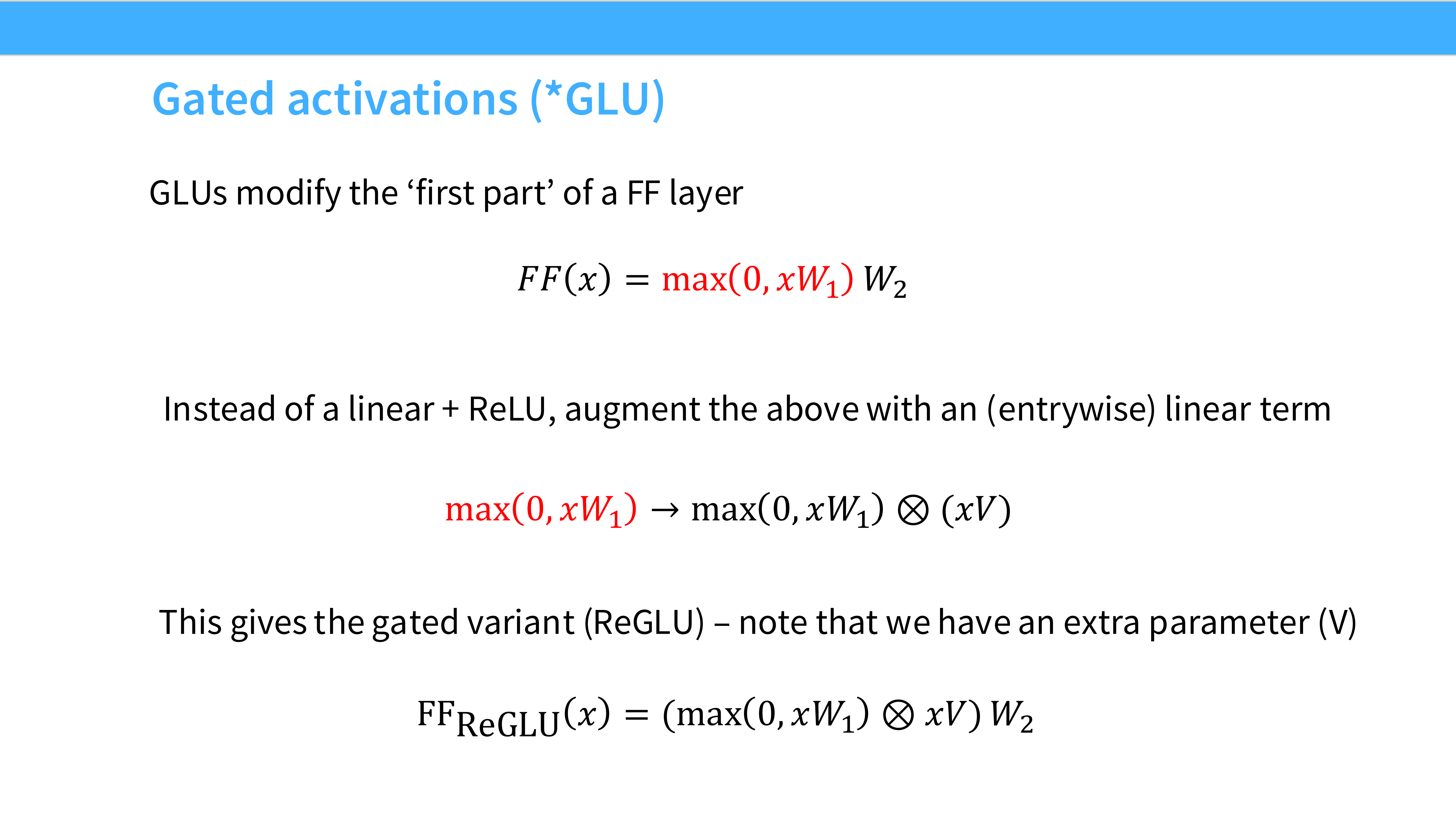 - GLU FFN: $(Act(xW_1) \odot xV_1) W_2$