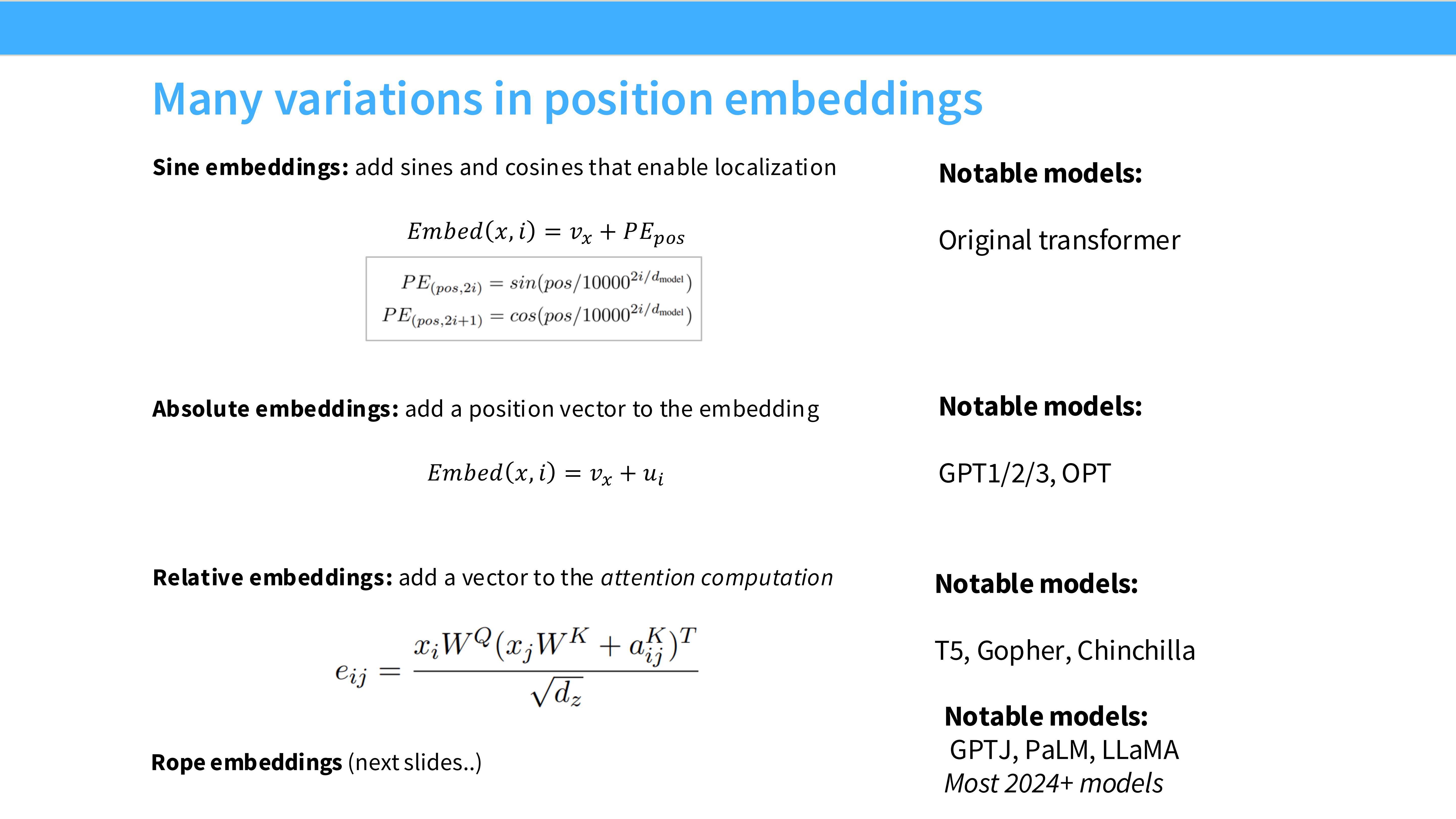 - RoPE: 几乎所有现代模型(除了 ALiBi 的少数拥护者)都使用。