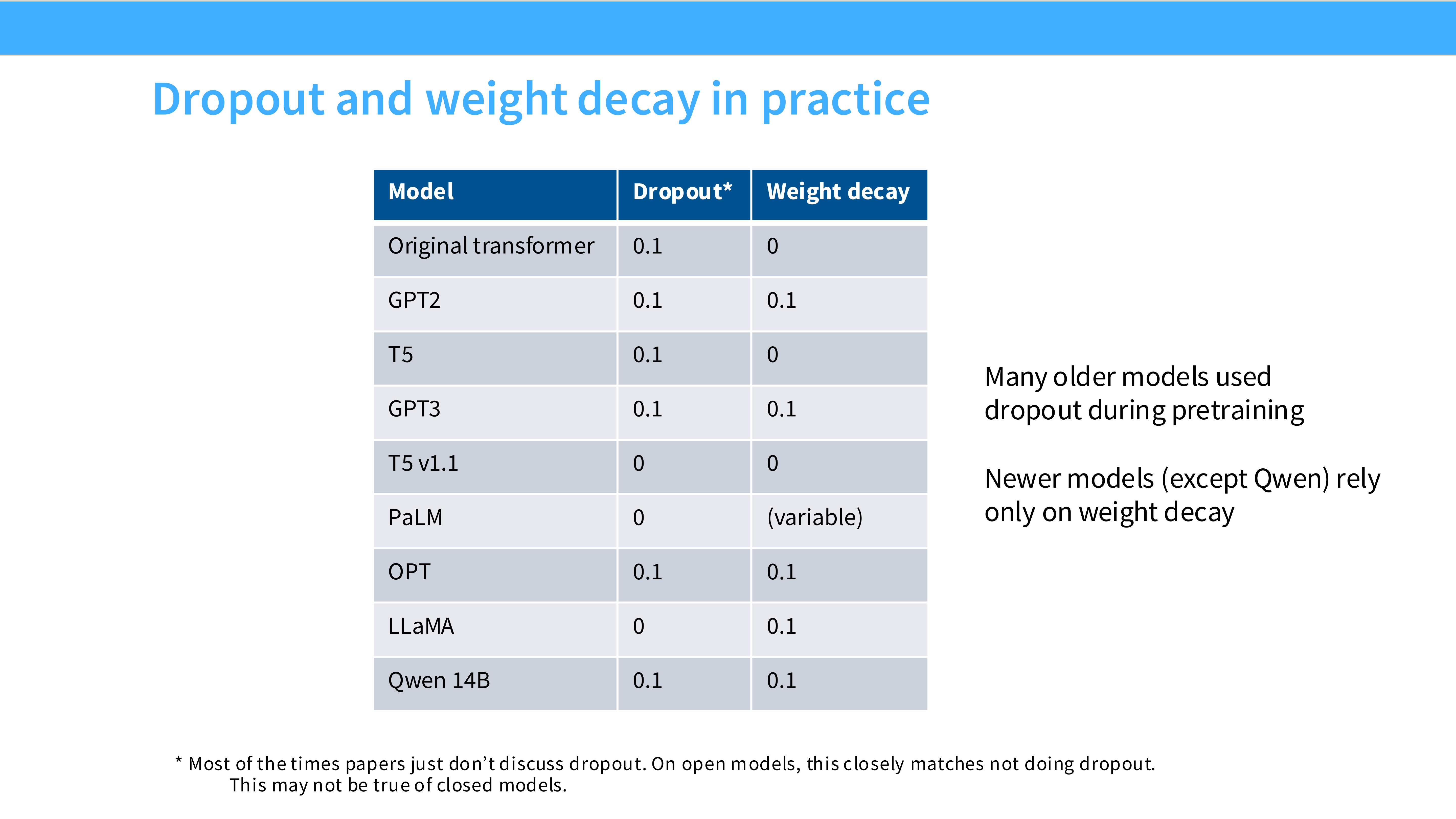 - 原因: 我们的数据量太大了(Trillions tokens),模型根本记不住,不存在过拟合。Dropout 只会浪费计算资源并减慢收敛。Llama, PaLM 全都把 Dropout 关了。
