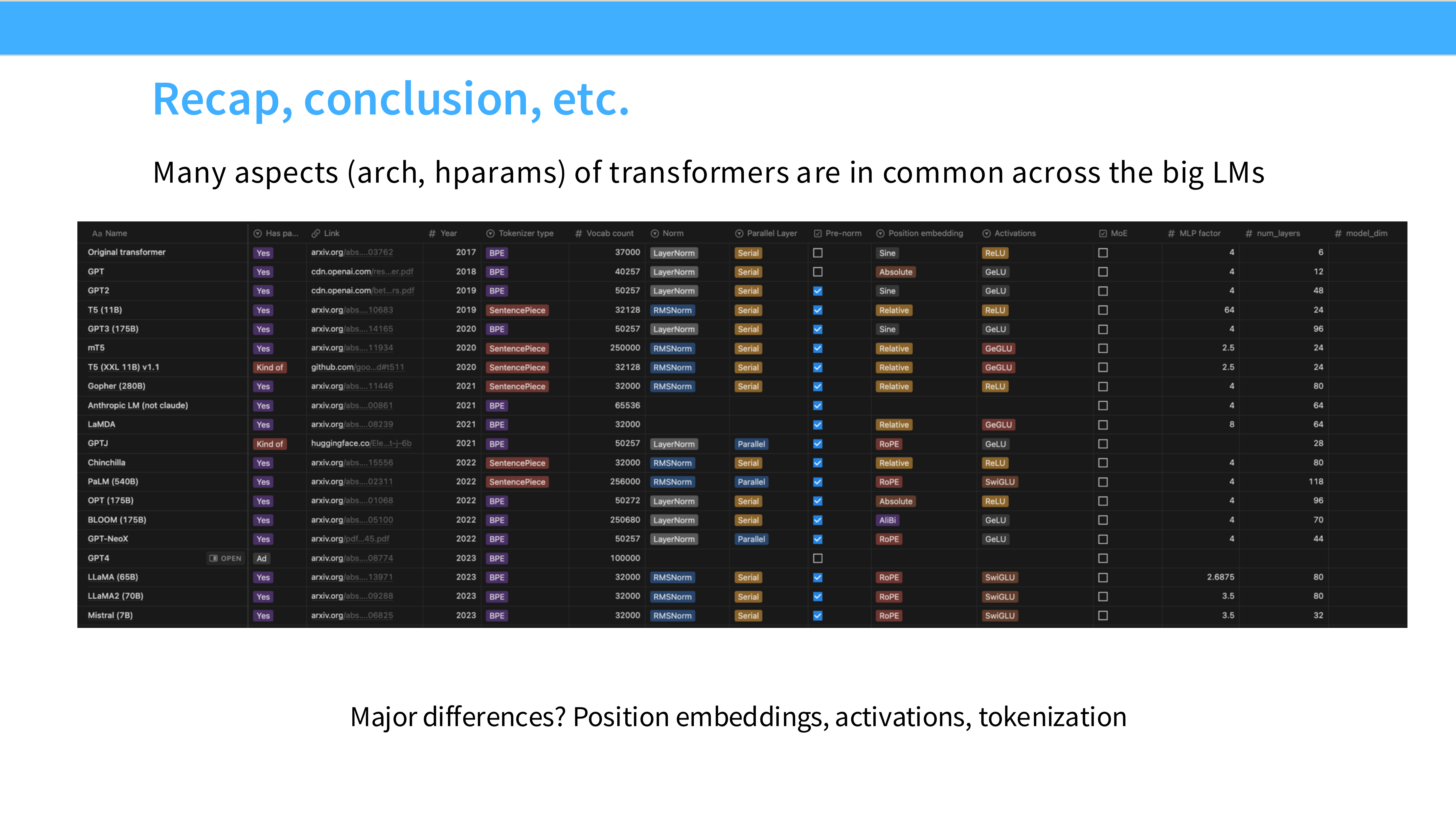- 内容: 一个详细的表格,横轴是模型(GPT-3, PaLM, Llama, Chinchilla 等),纵轴是配置(Norm 类型, Pos Emb, Activation)。