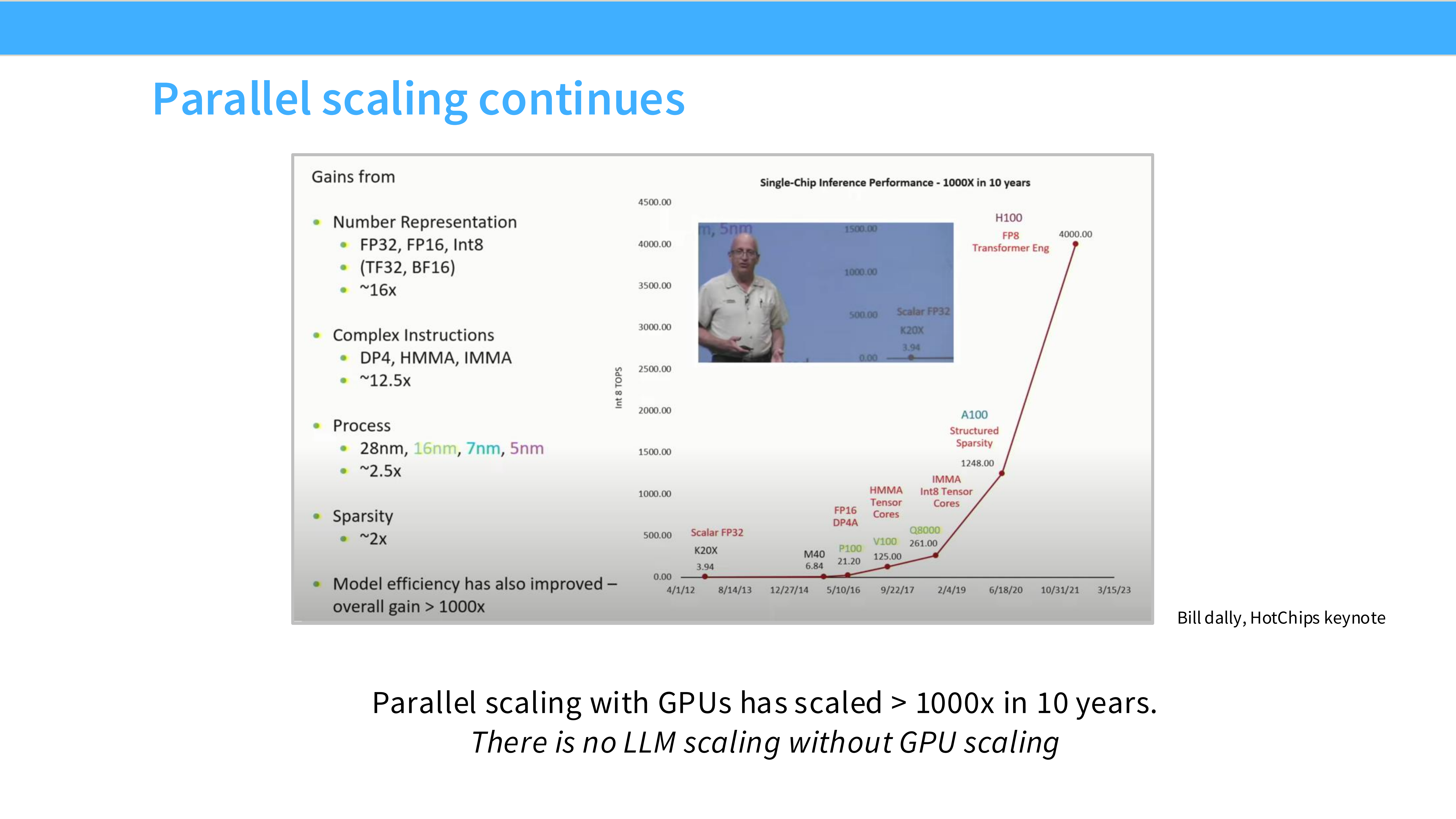 - 结论: LLM 的扩展完全依赖于 GPU 的并行扩展能力。