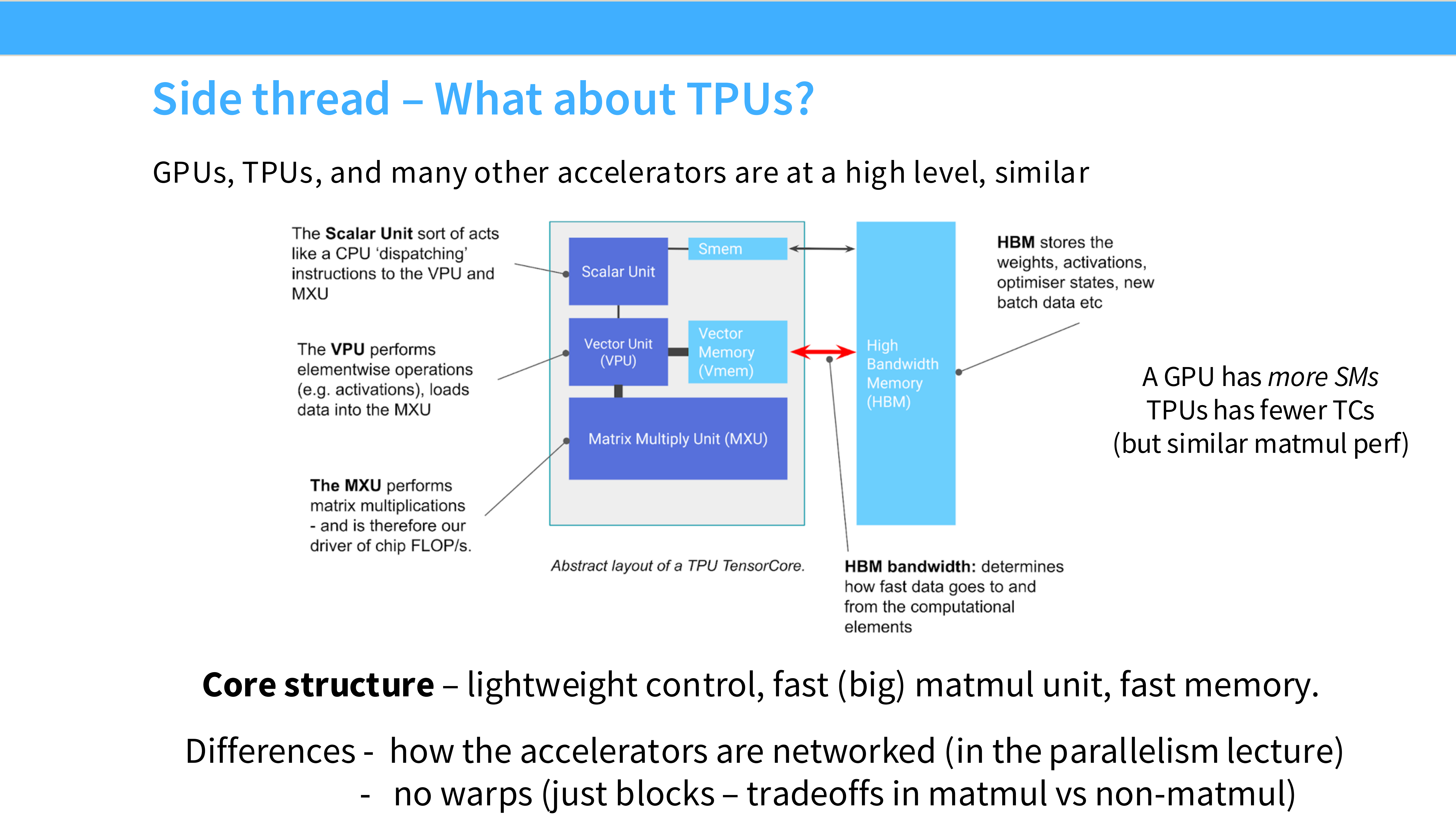 - 权衡: TPU 牺牲了通用性(Lightweight control),换取了极致的矩阵乘法密度。但在内存带宽(HBM)上,两者面临相似的物理限制。