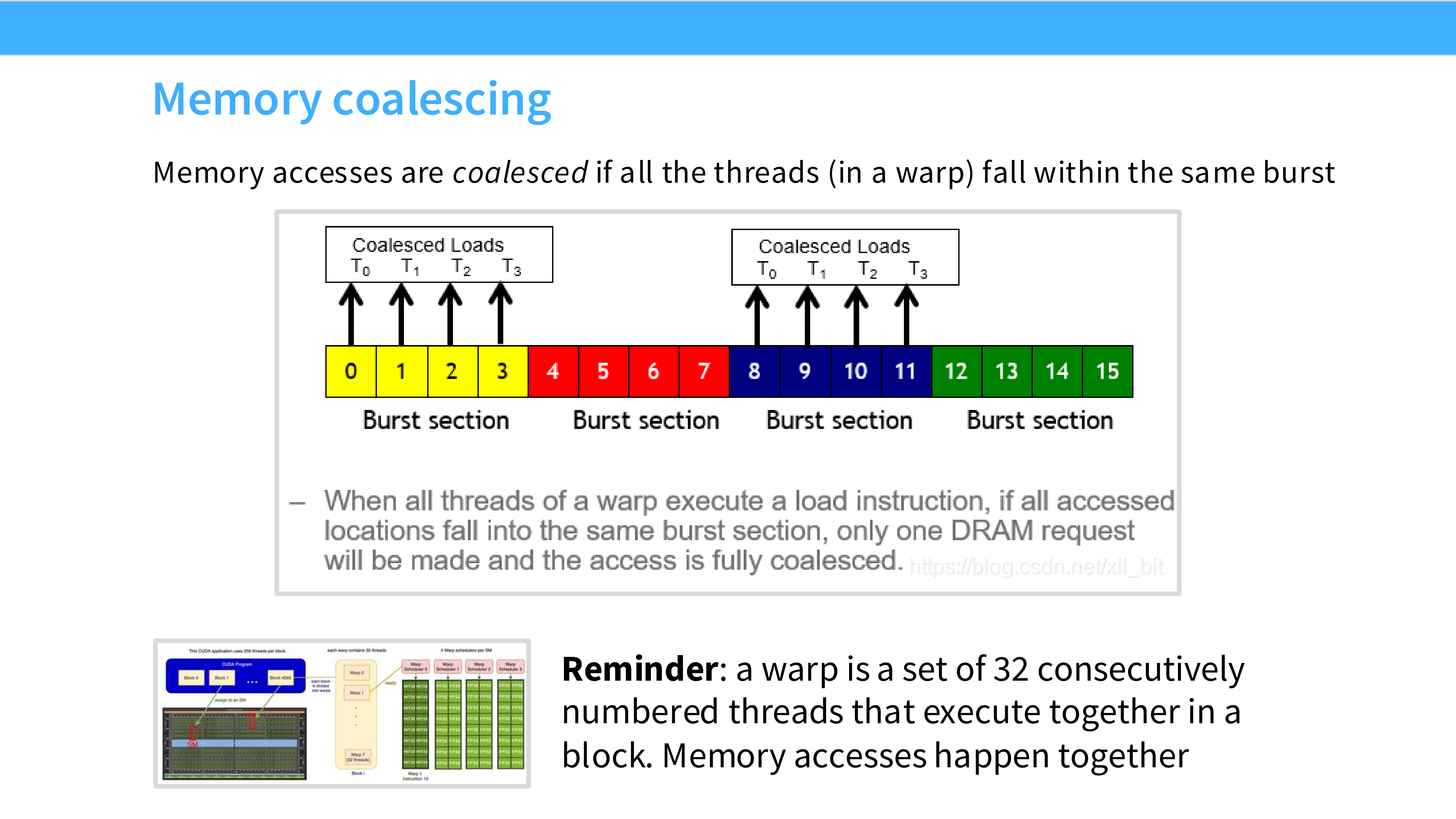 - Coalescing: 对齐内存访问。