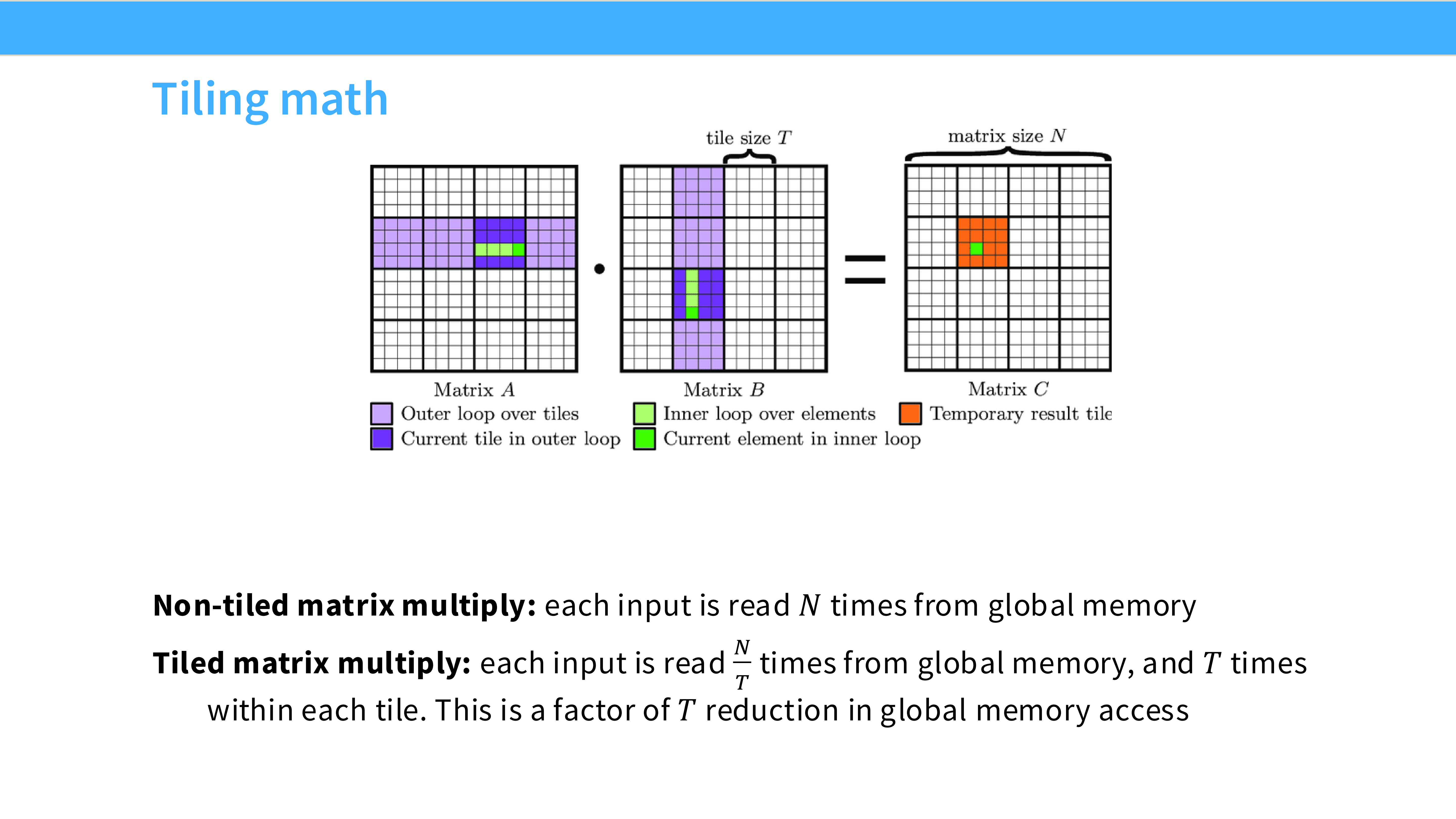 - 收益: 内存访问量减少了 $T$ 倍。这是矩阵乘法高效的根本原因。