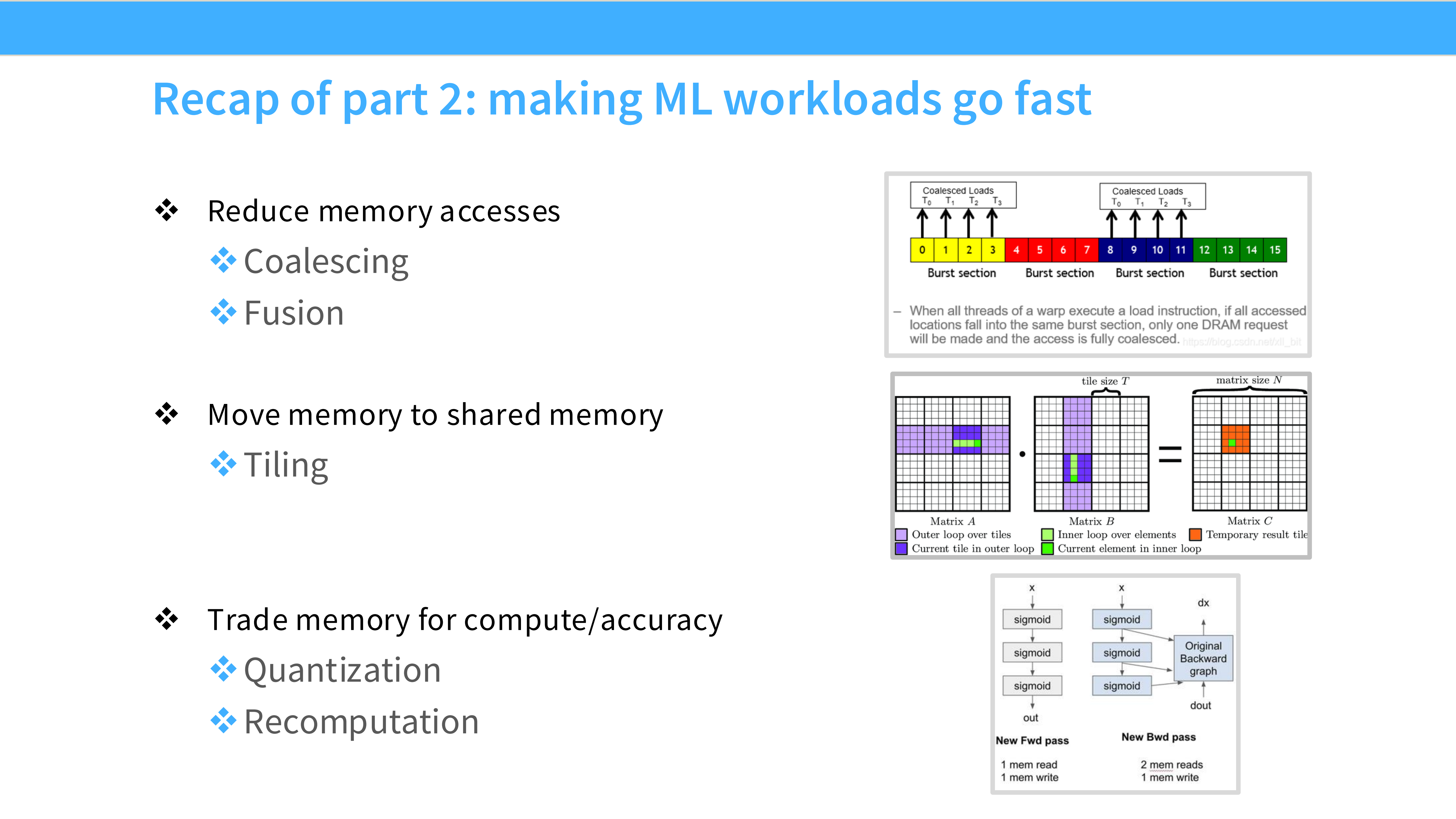 - Reduce memory access: 通过 Coalescing 和 Fusion。
