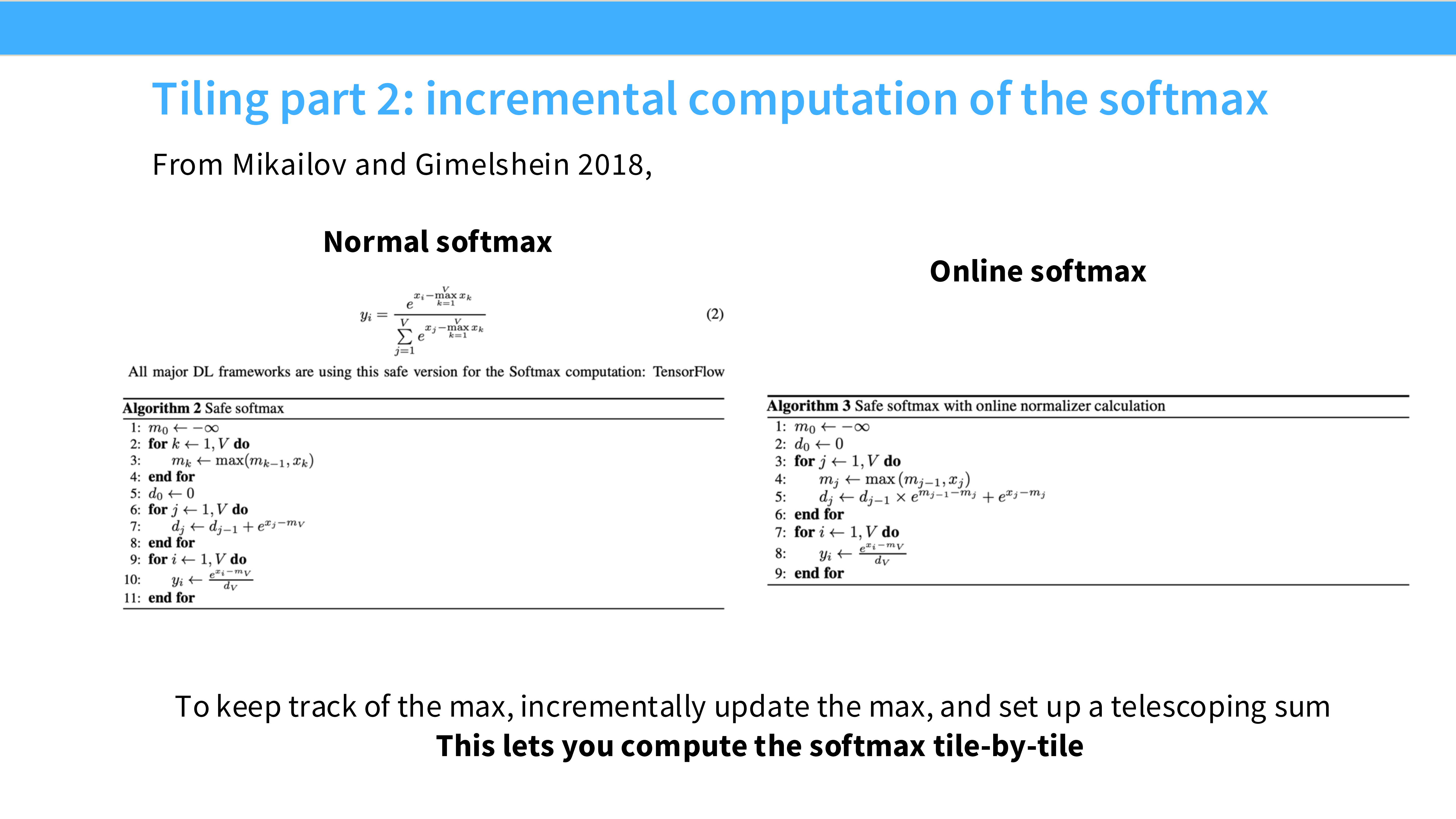 - 这是 FlashAttention 的算法创新。引用了 Mikailov 2018 的论文。