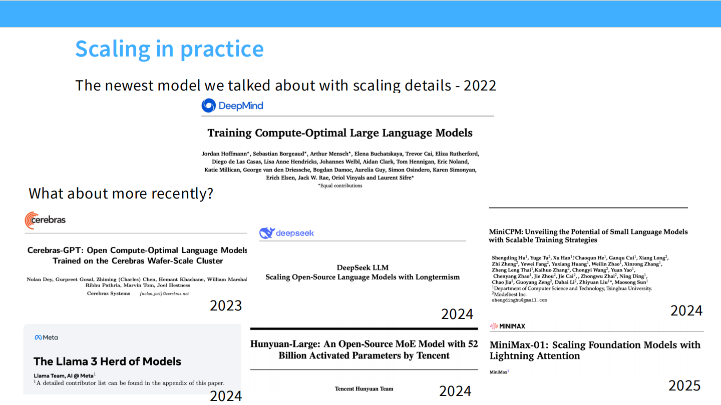 - 2023: Cerebras-GPT —— 验证了在特定硬件上复现 Chinchilla 规律。