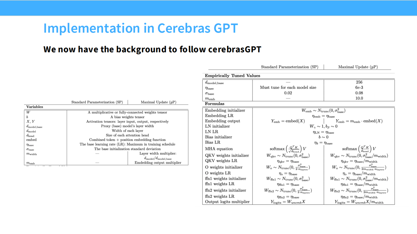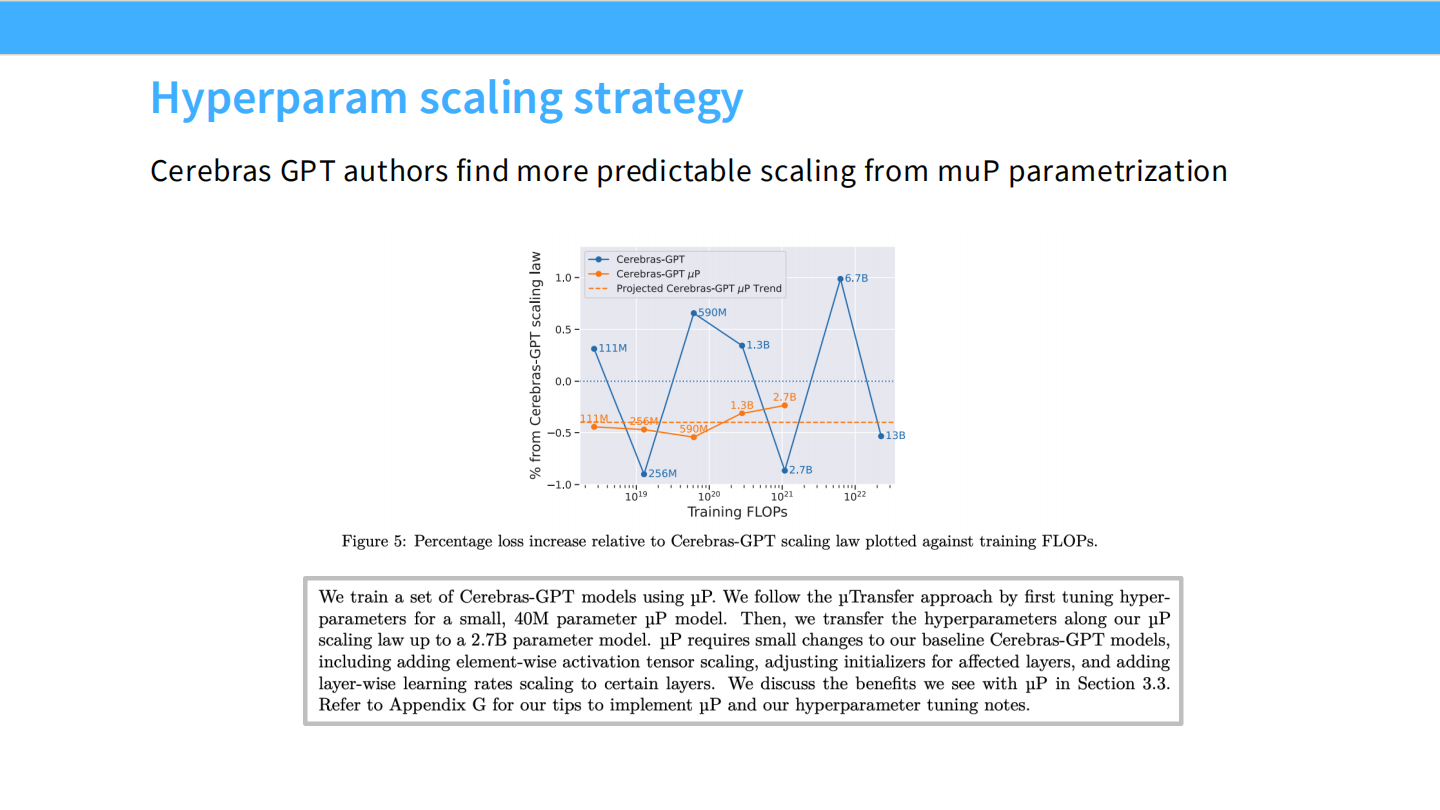 - 发现: 随着模型变大(Training FLOPS 增加),最佳的学习率(Learning Rate)并不是恒定的,也不是随意设定的,而是遵循某种规律。Cerebras 作者发现使用 muP (Maximal Update Parametrization) 可以让这种规律变得非常可预测。