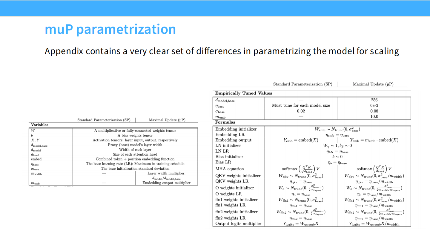 - 表格: 附录中展示了标准参数化(Standard Parameterization, SP)与 muP 的具体区别。