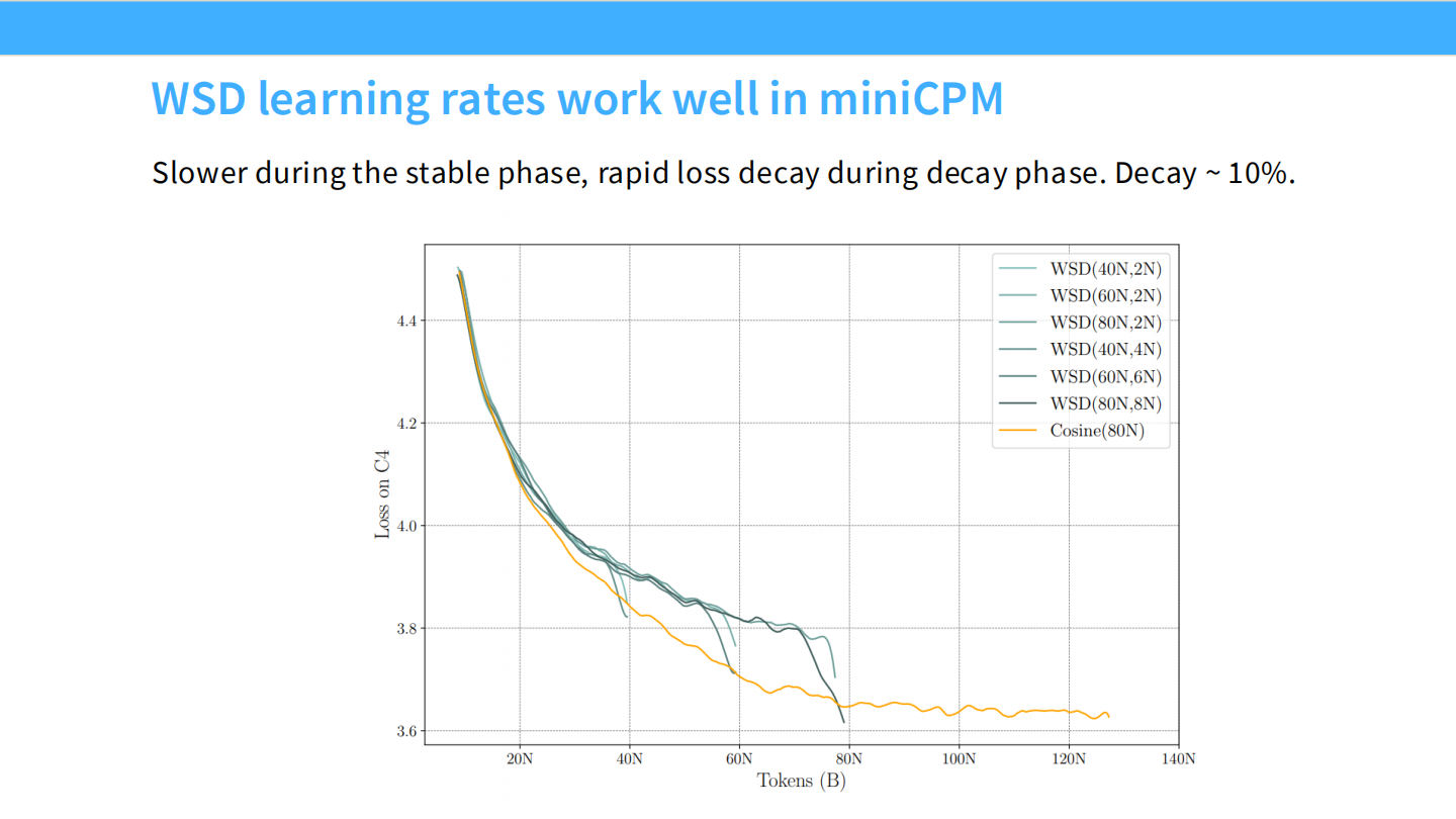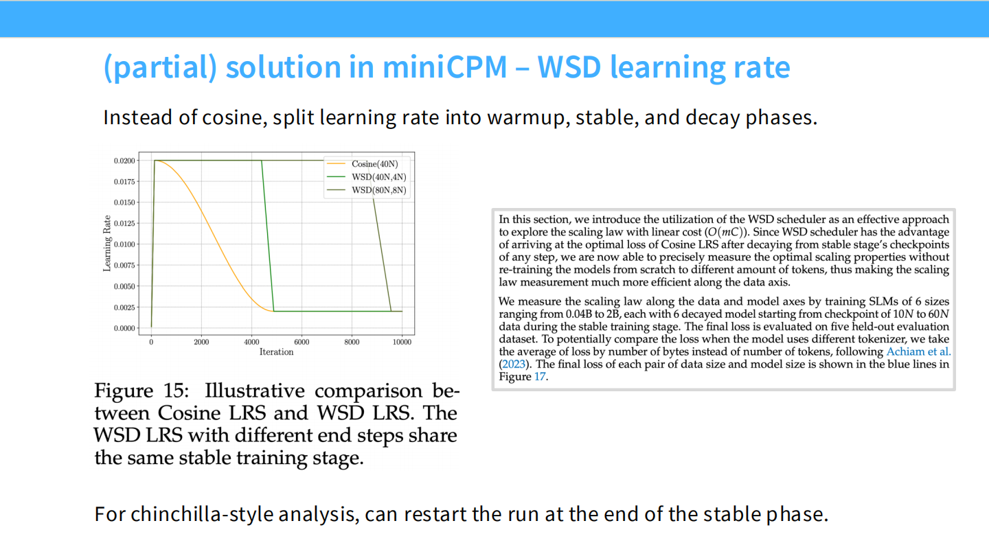 - 图表: 展示了在 MiniCPM 训练中,LR 在 Stable 阶段保持高位,Loss 缓慢下降。一旦进入 Decay 阶段,Loss 迅速下降约 10% 并收敛。
