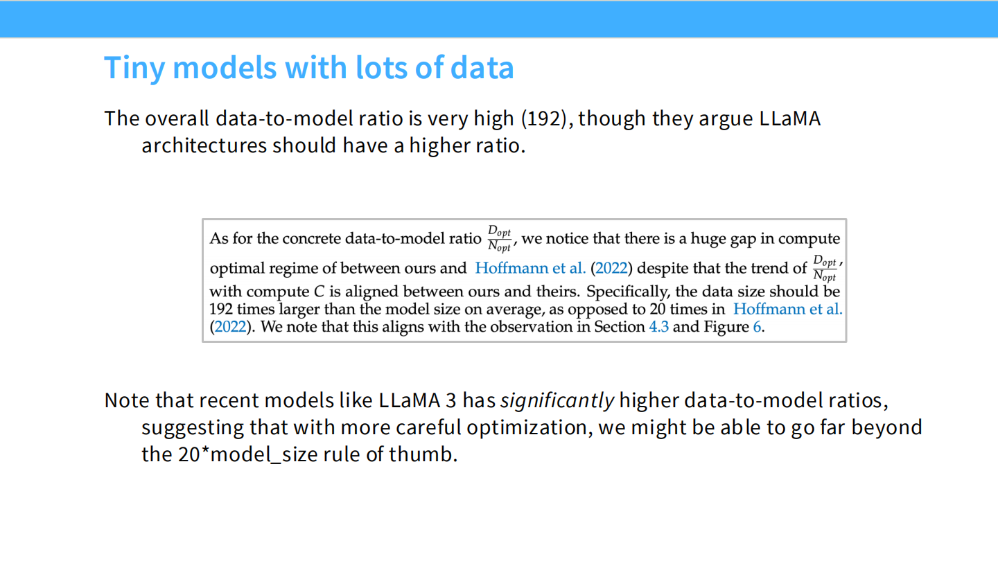 - 现象: 现在的模型(如 Llama 3)数据量远超 Chinchilla 建议(20倍)。Llama 3 达到了 192 倍甚至更多。