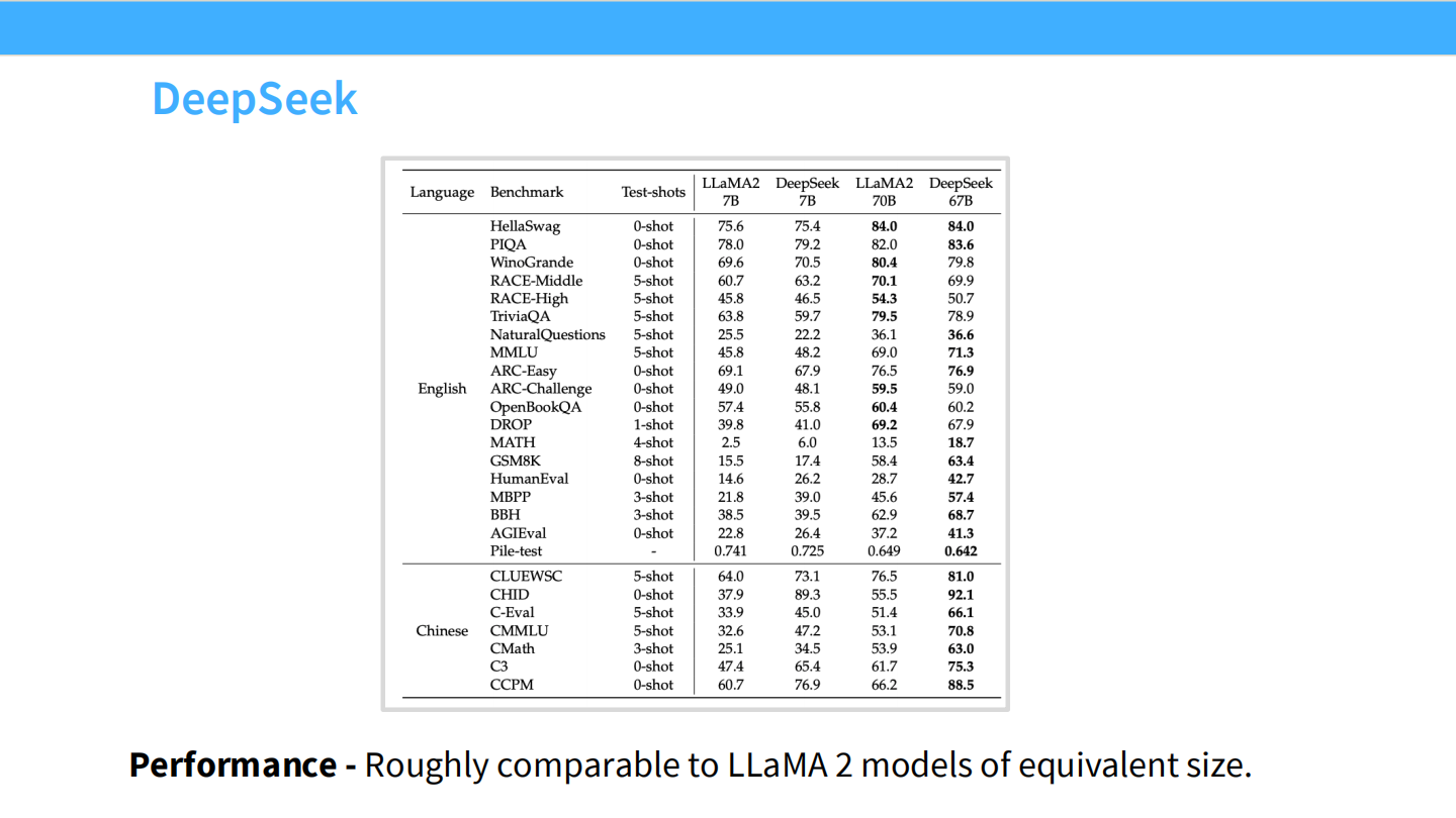 - 表格: DeepSeek 7B/67B 的跑分。性能与同级别的 Llama 2 相当或更好。