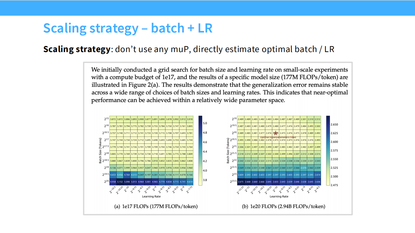 - 搜索: 在小规模上搜 LR/Batch,然后预测。