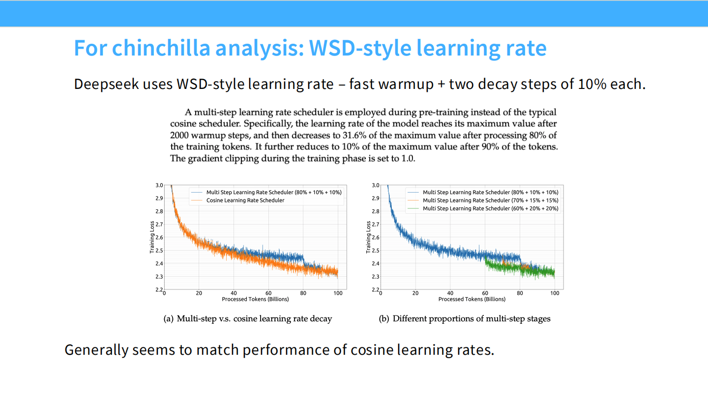 - 内容: DeepSeek 使用了 WSD 变体:快速 Warmup,然后保持 Stable,最后分阶段 Decay (80% + 10% + 10%)。