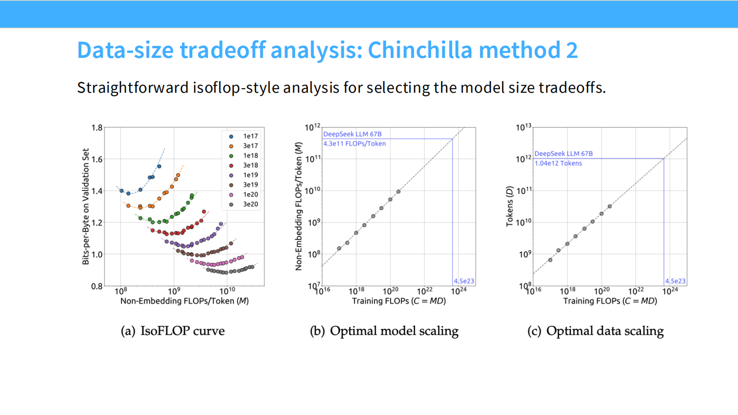 - 图表: DeepSeek 复现了 Chinchilla 的 IsoFLOP 曲线(左图)和最优模型/数据扩展曲线(中/右图)。