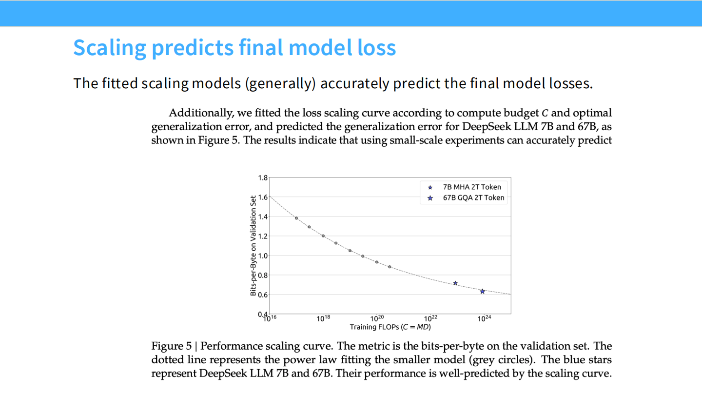 - 图表: DeepSeek 在 7B 和 67B 模型发布时,也做了详尽的 Scaling 分析。验证了在小规模模型上拟合的规律可以准确预测大模型。