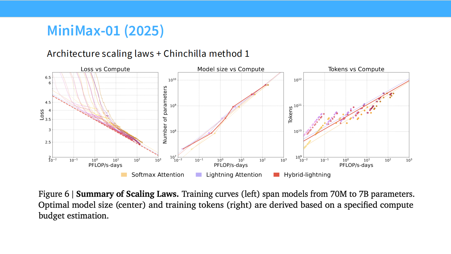 - 亮点: MiniMax 采用了 Lightning Attention(线性 Attention)。这表明非 Transformer 架构也遵循类似的 Scaling 规律。