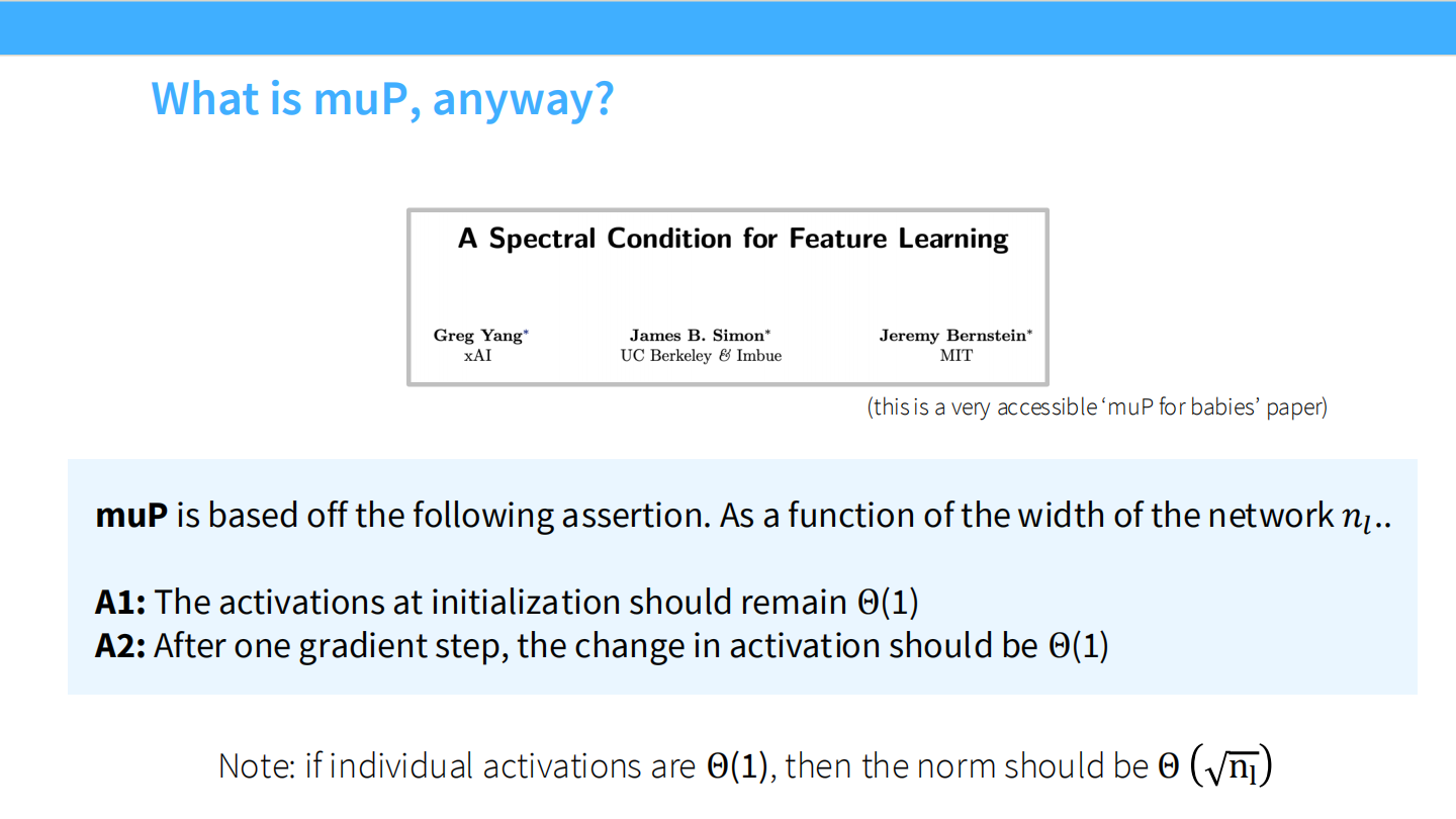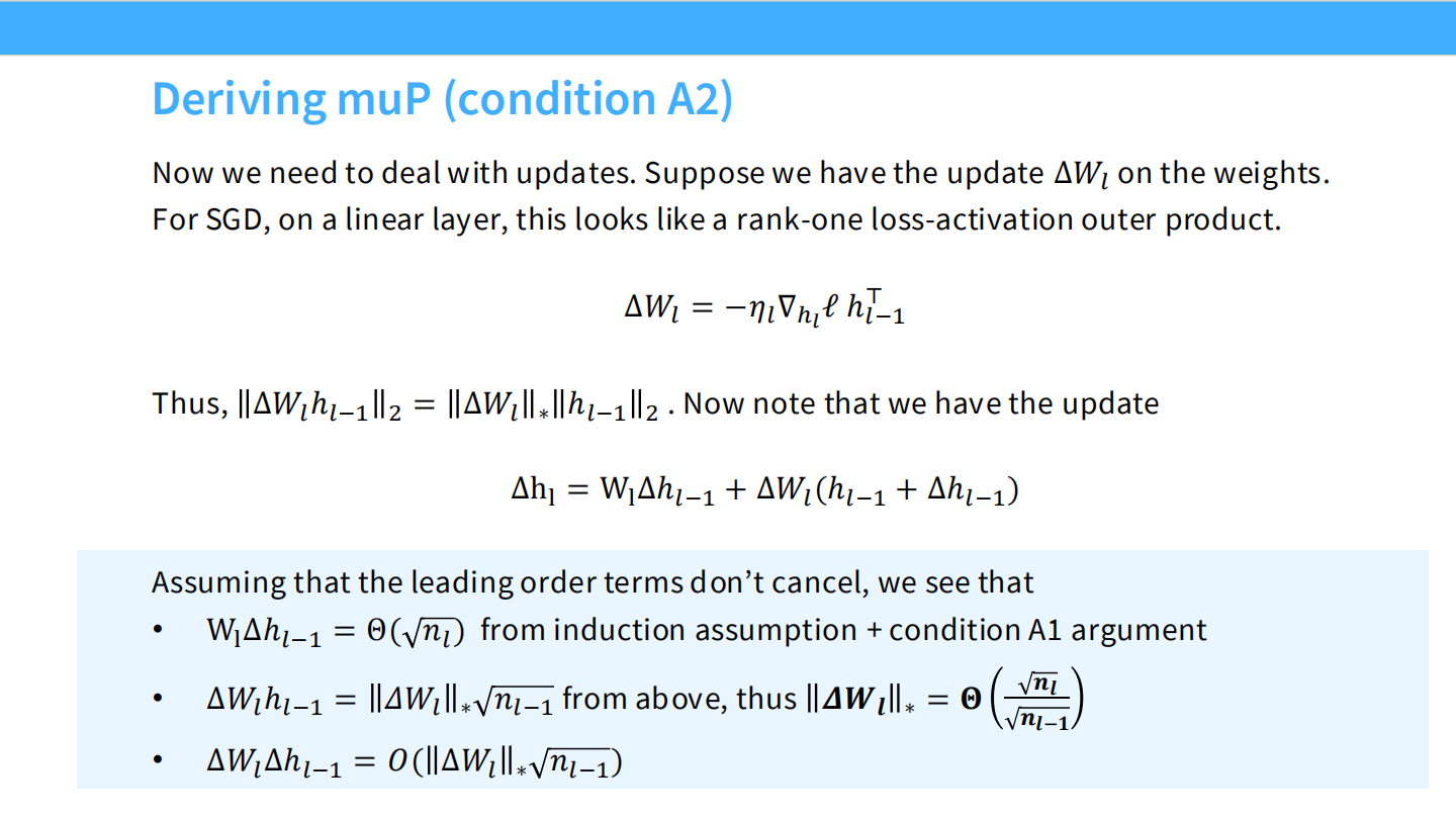 - 内容: 引用 muP 原论文的定义。A1 (Init) 和 A2 (Update) 条件。