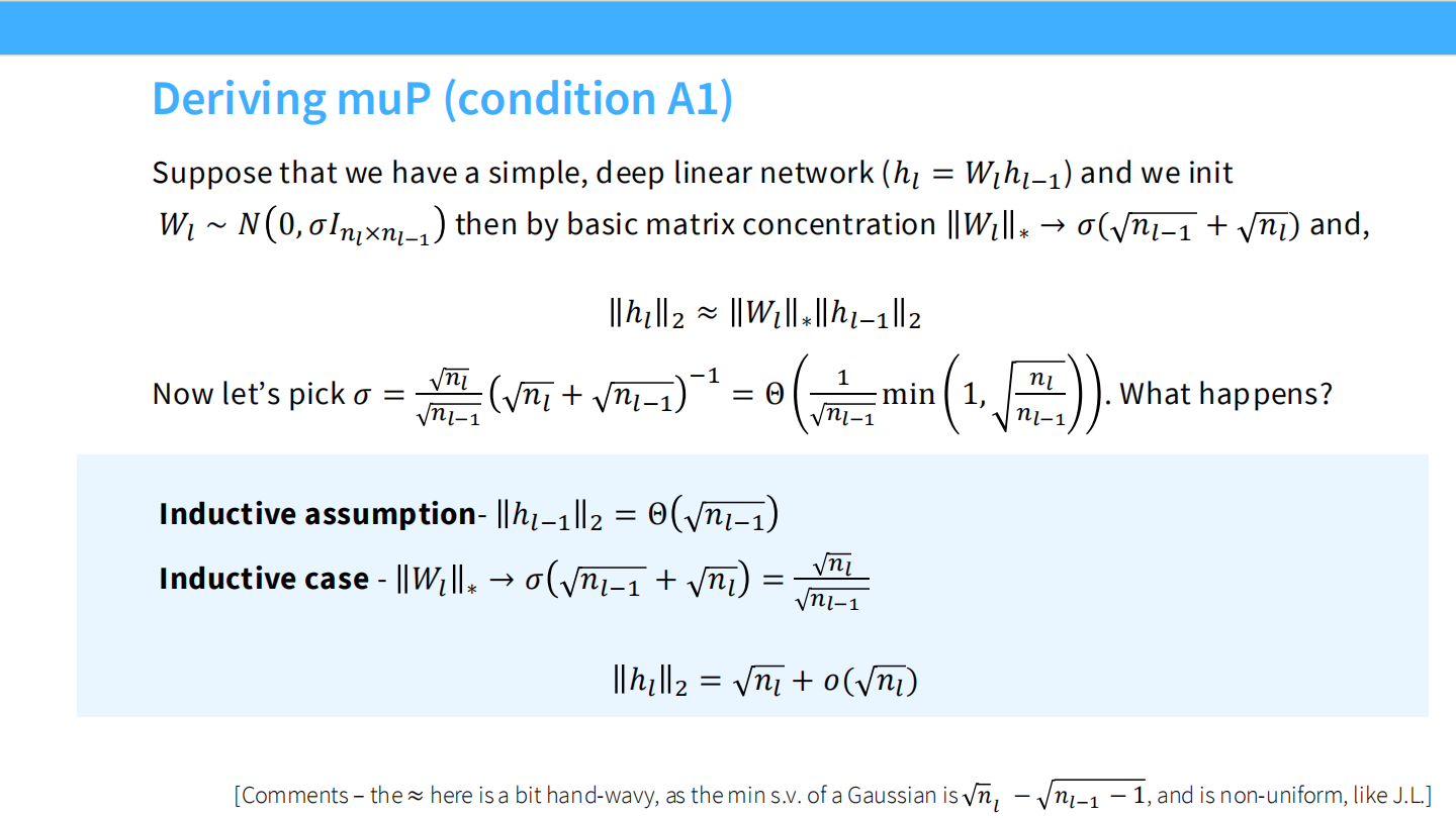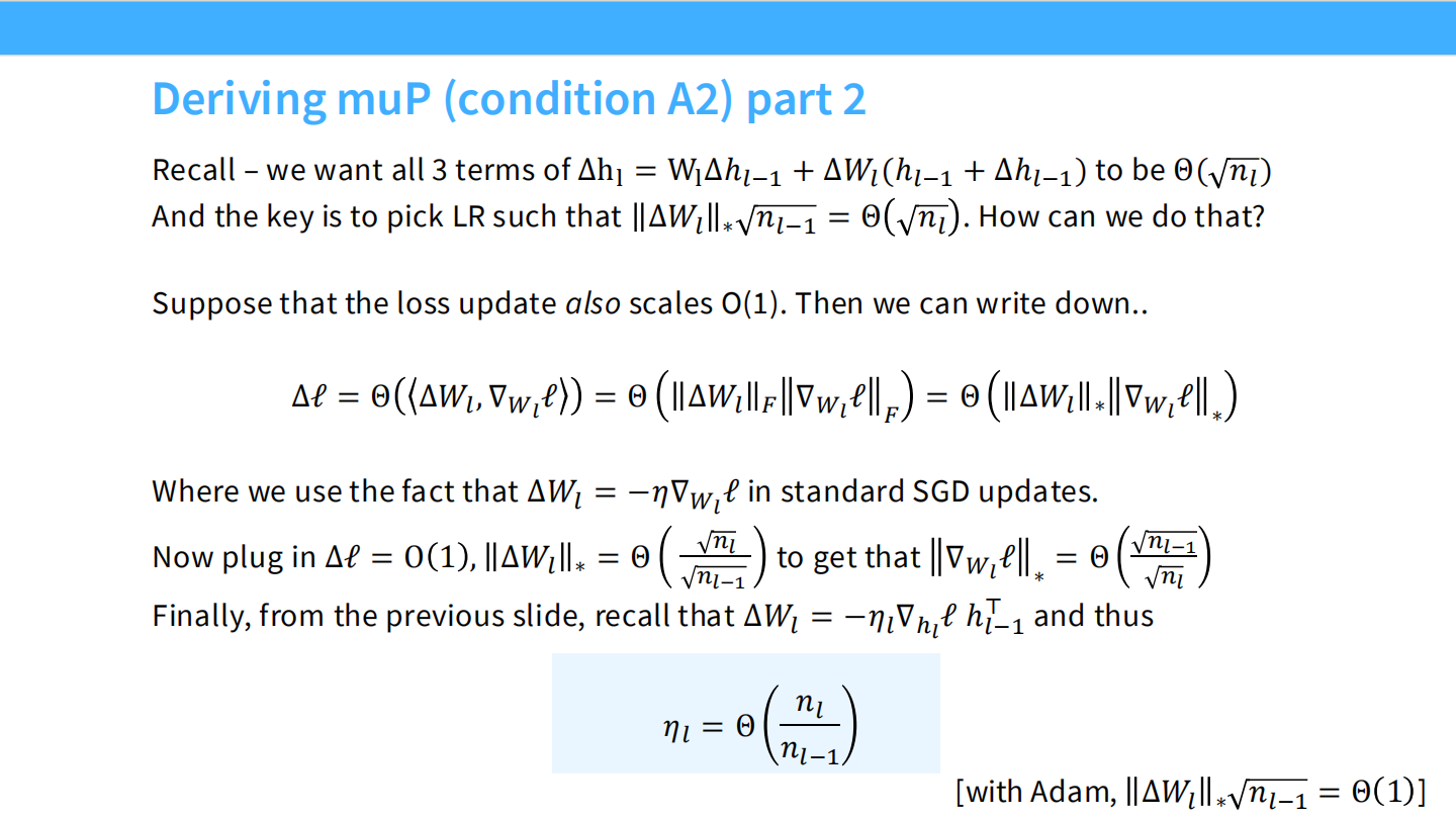 - 结论: 为了满足上述条件,学习率 $\eta$ 必须随着宽度 $n_l$ 的增加而减小,具体来说 $\eta_l = \Theta(1/n_{l-1})$。