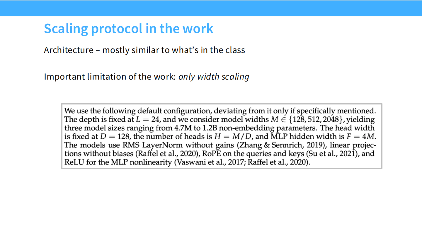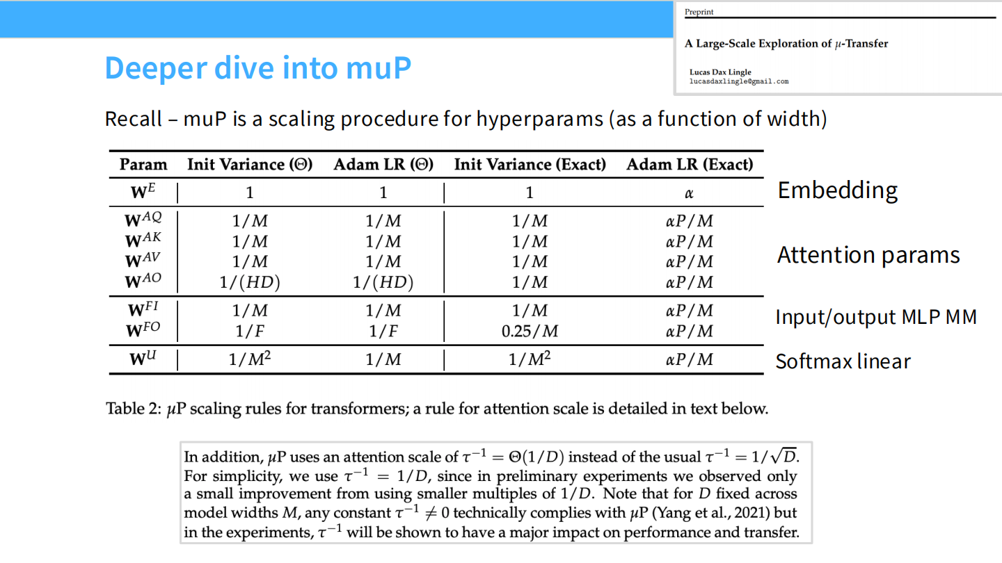 - Attention Scaling: muP 使用 $1/D$ 而不是 $1/\sqrt{D}$。