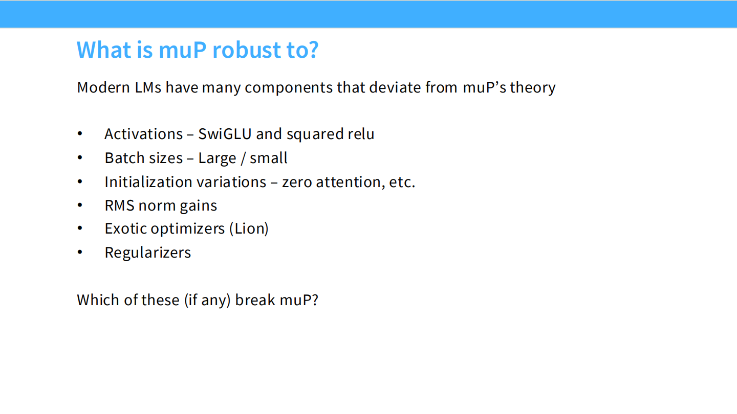 - 背景: 现代 LLM 有很多组件(如 SwiGLU, RMSNorm)并不在 muP 最初的理论假设中。muP 还能用吗?