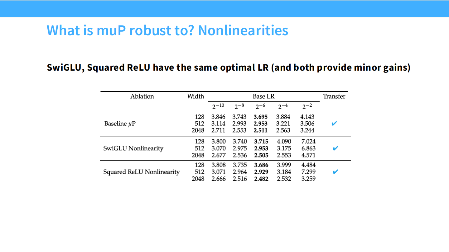 - 结论: 无论是 SwiGLU 还是 Squared ReLU,muP 都能保持最佳 LR 的稳定性。