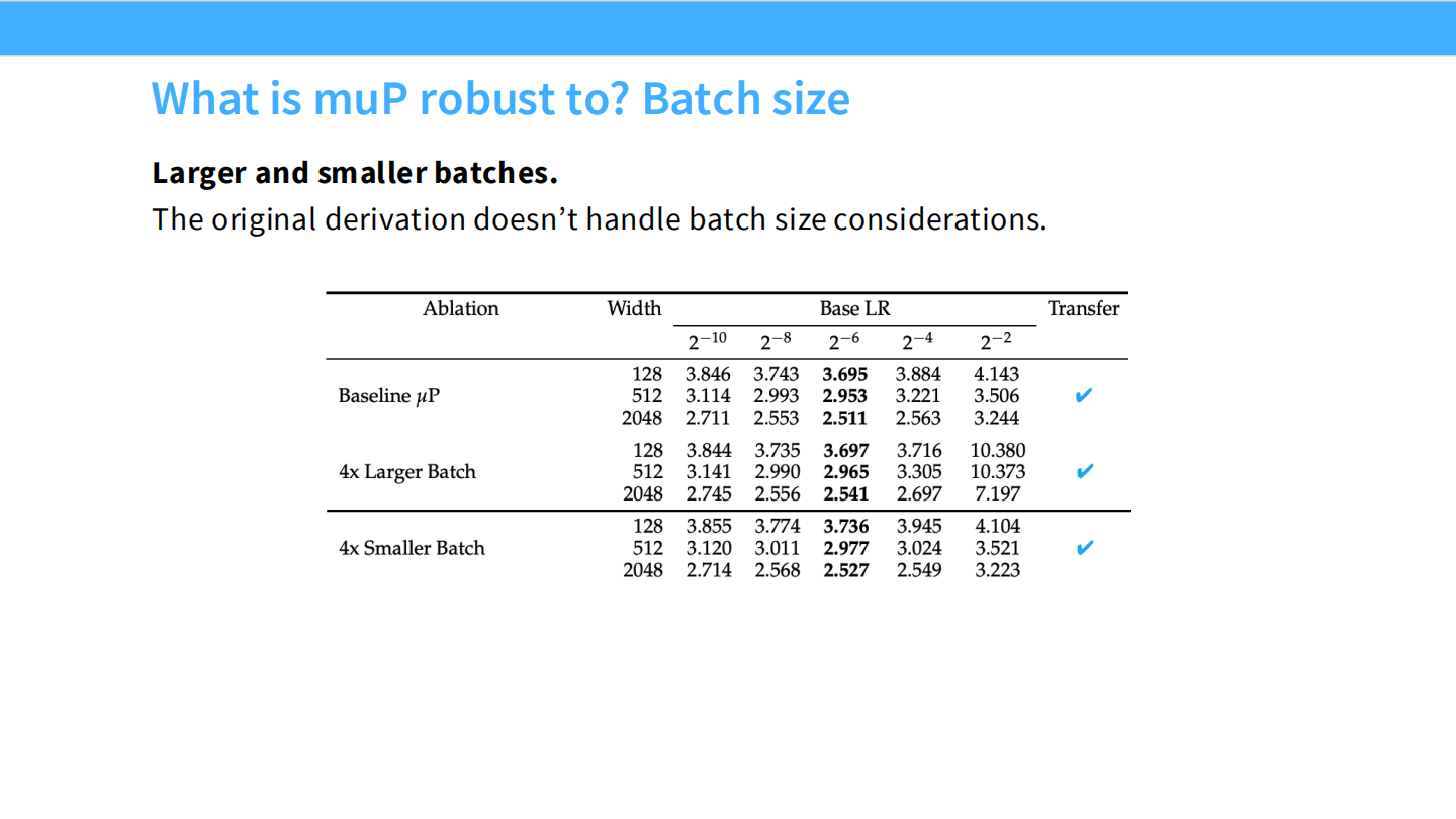 - 结论: Batch Size 的变化不影响 muP 的 LR 迁移规律。虽然原始推导没考虑 Batch Size,但经验上是兼容的。