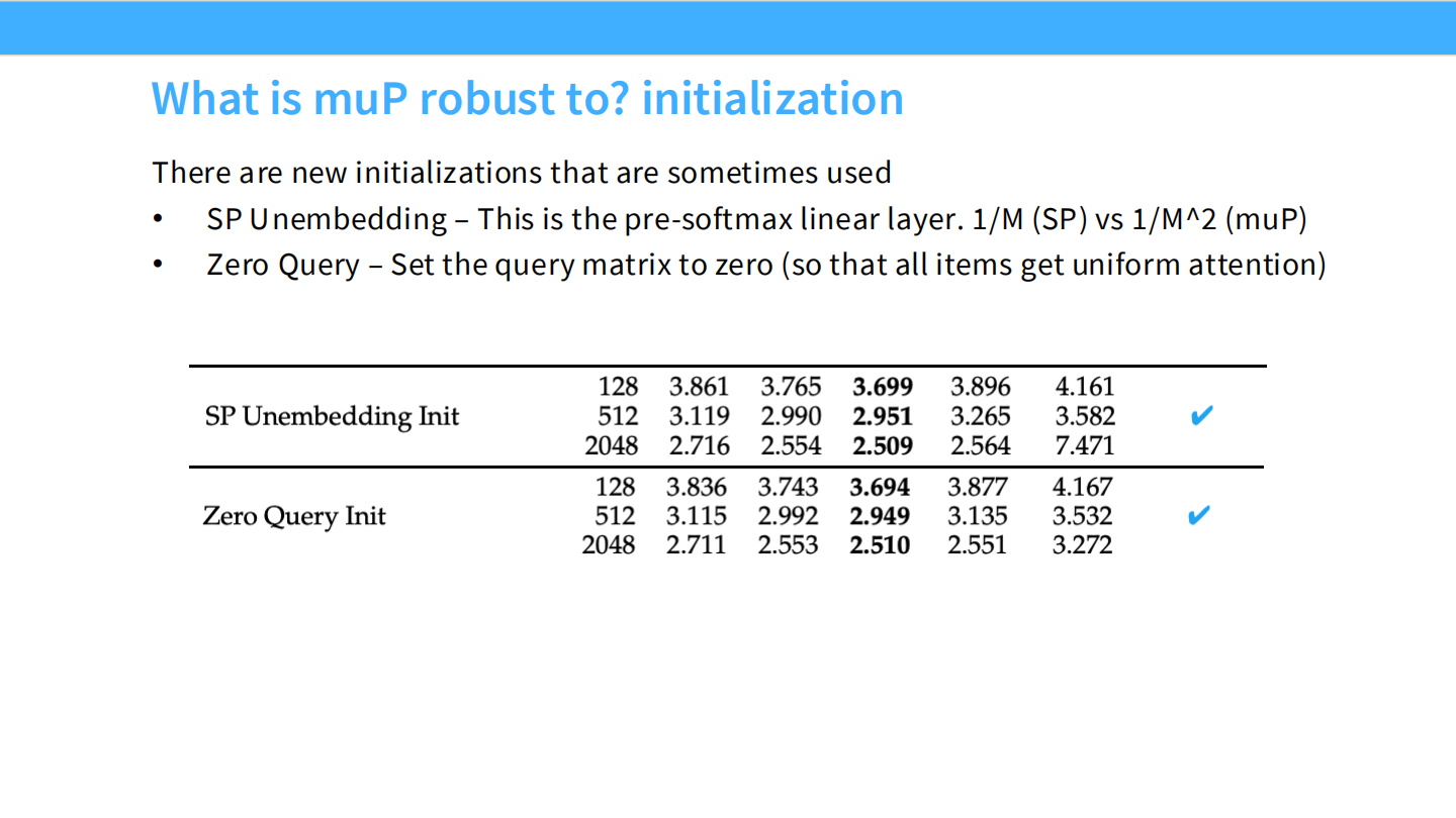 - 结论: 使用 Zero Query Init(将 Query 初始化为 0)等技巧也不影响 muP。