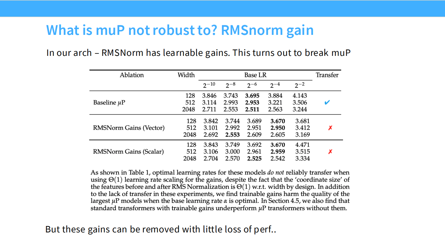 - 现象: 如果 RMSNorm 带有可学习的增益参数(Gain $\gamma$),muP 失效。