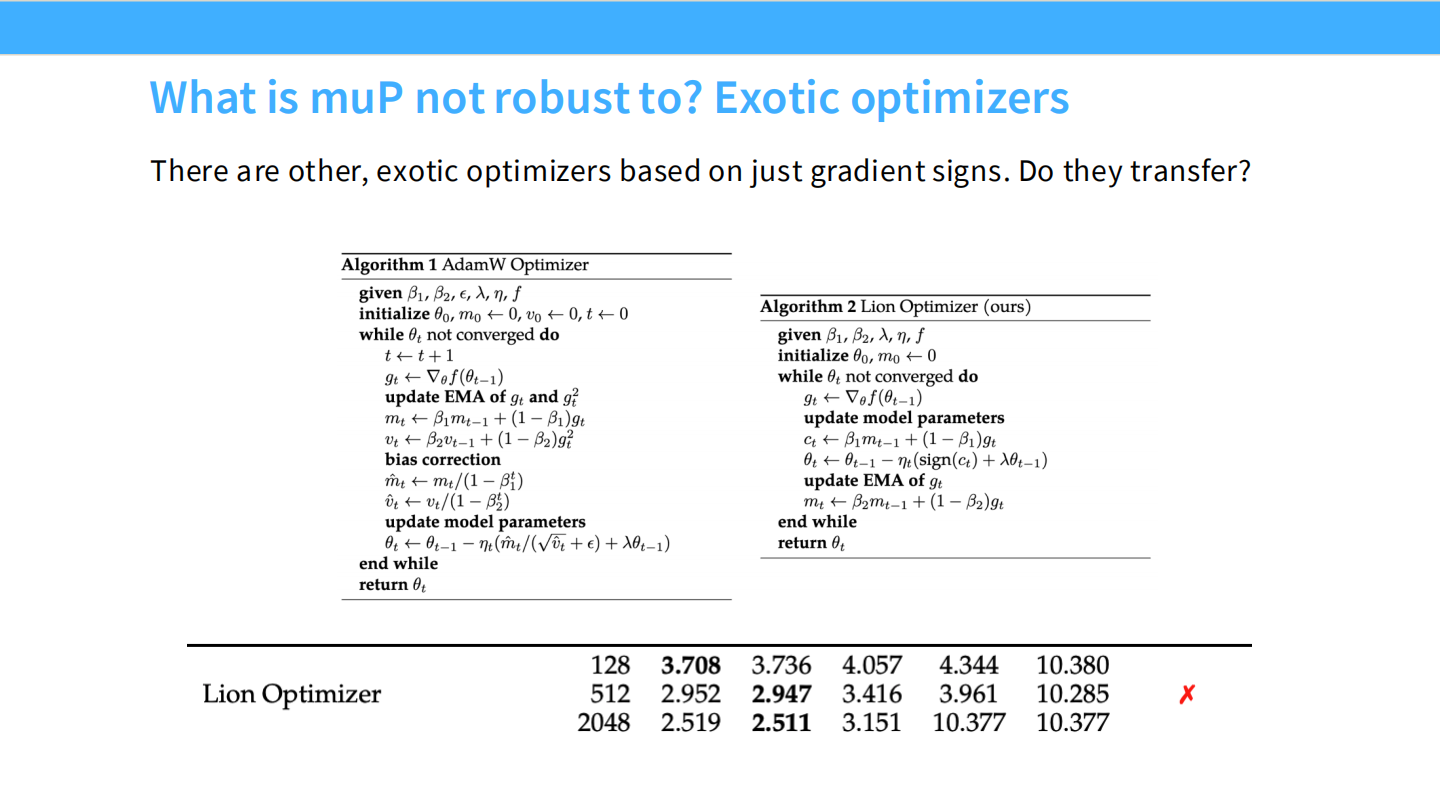 - 现象: Lion 优化器基于符号(Sign),不符合 muP 的假设。无法直接迁移。
