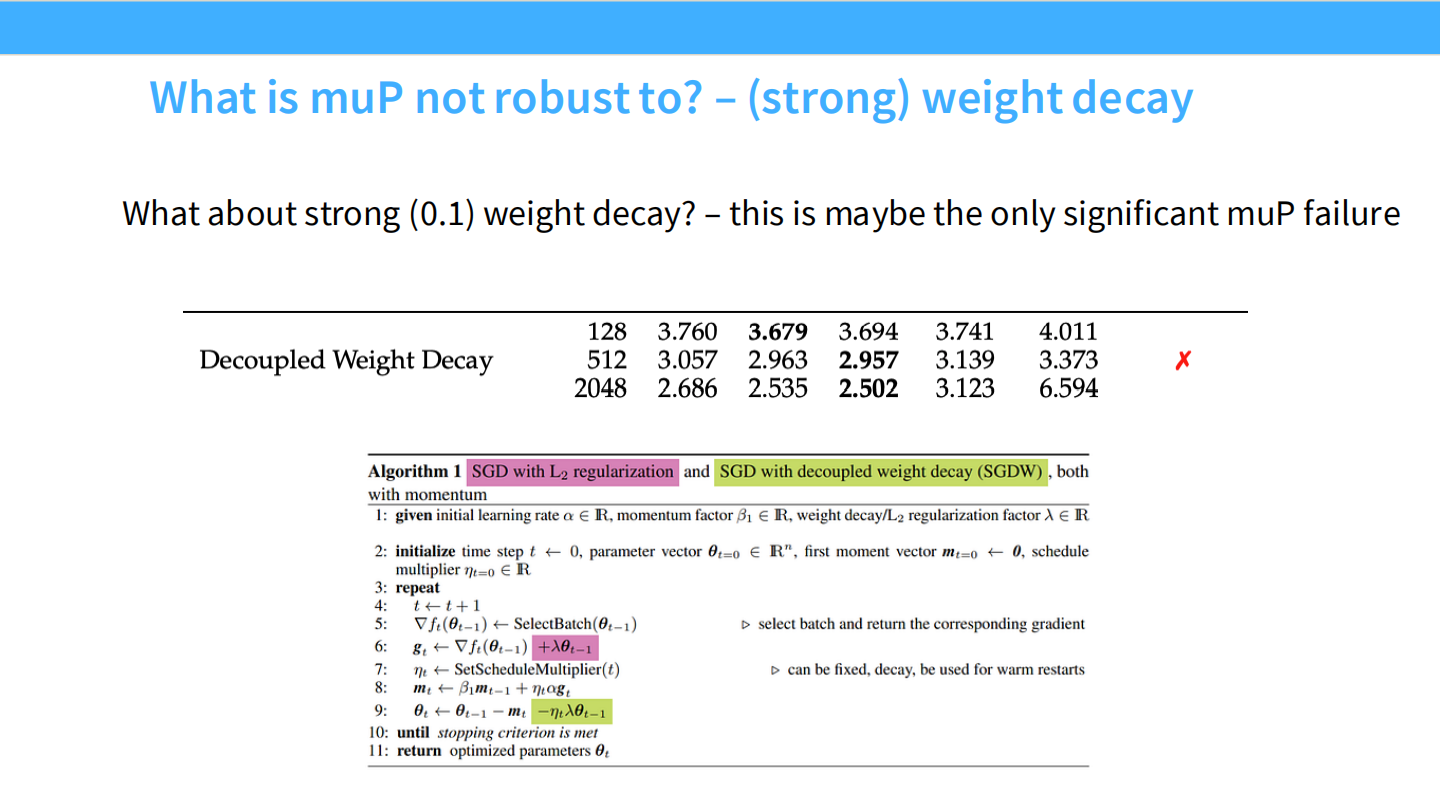 - 现象: 当 Weight Decay 设为 0.1(现代标准)时,muP 失效。这是一个主要短板。
