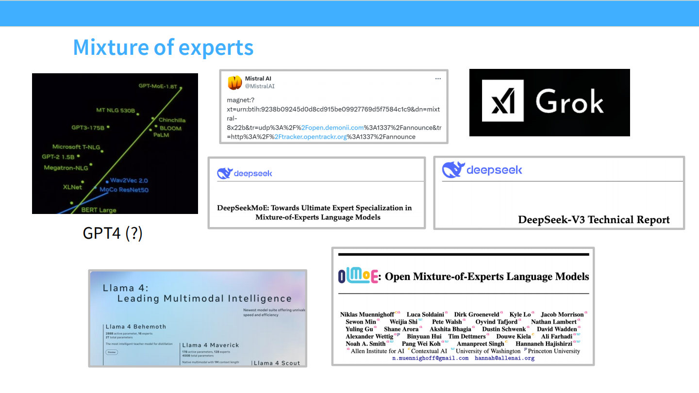 - 右侧情报: 拼贴了 Mistral AI(磁力链接泄露事件,代表 Mixtral 8x7B)、Grok(马斯克的 xAI 开源 MoE)、DeepSeek(深度求索的技术报告)以及 Llama 4(代号 Maverick/Behemoth)的相关信息。