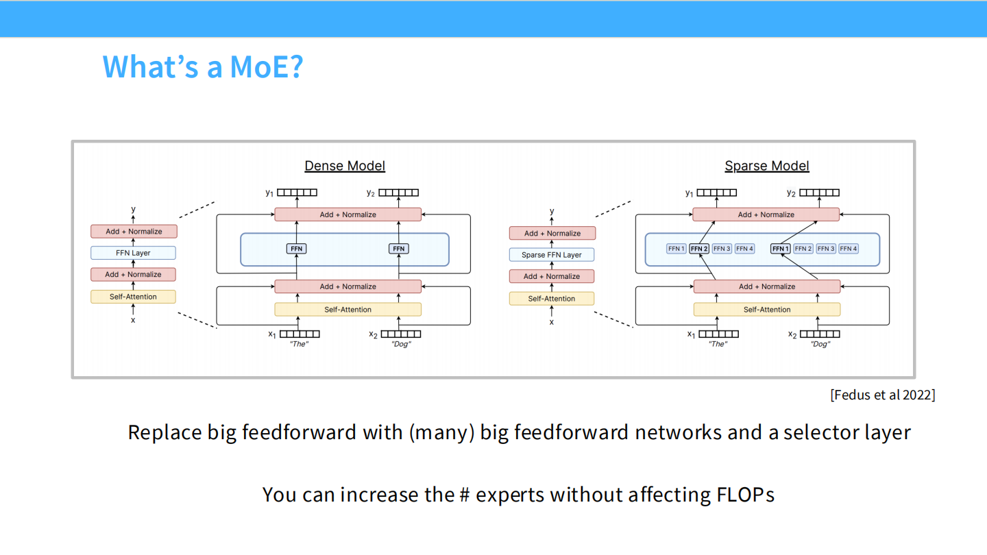 - 铁律: **”You can increase the # experts without affecting FLOPs”**。这意味着你可以无限增加模型的总参数量(知识容量),而不增加推理时的计算量(延迟/成本)。