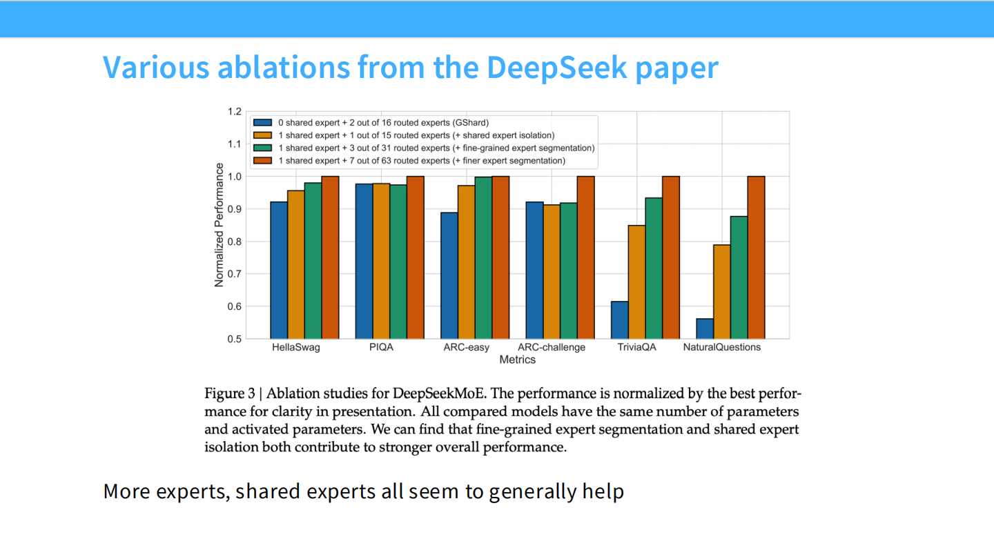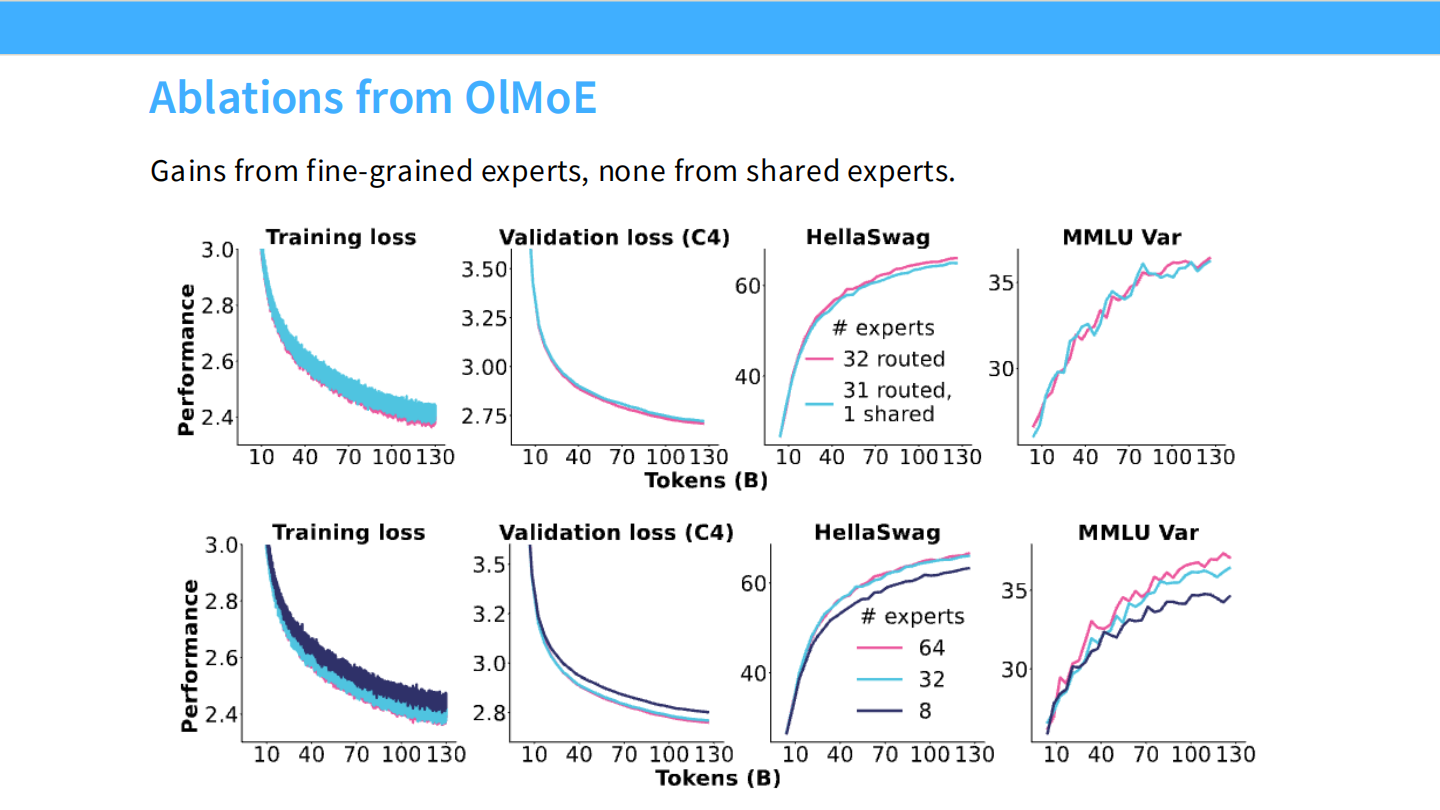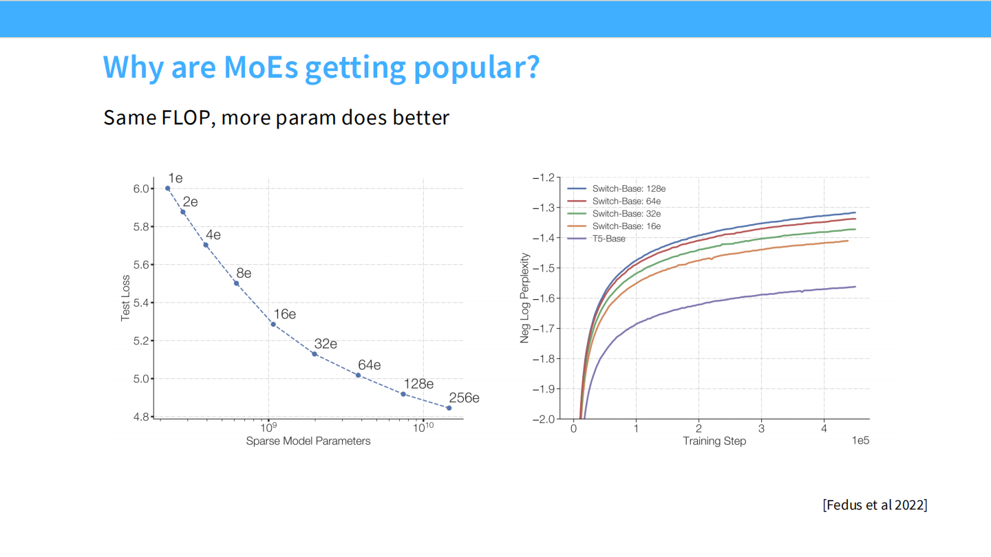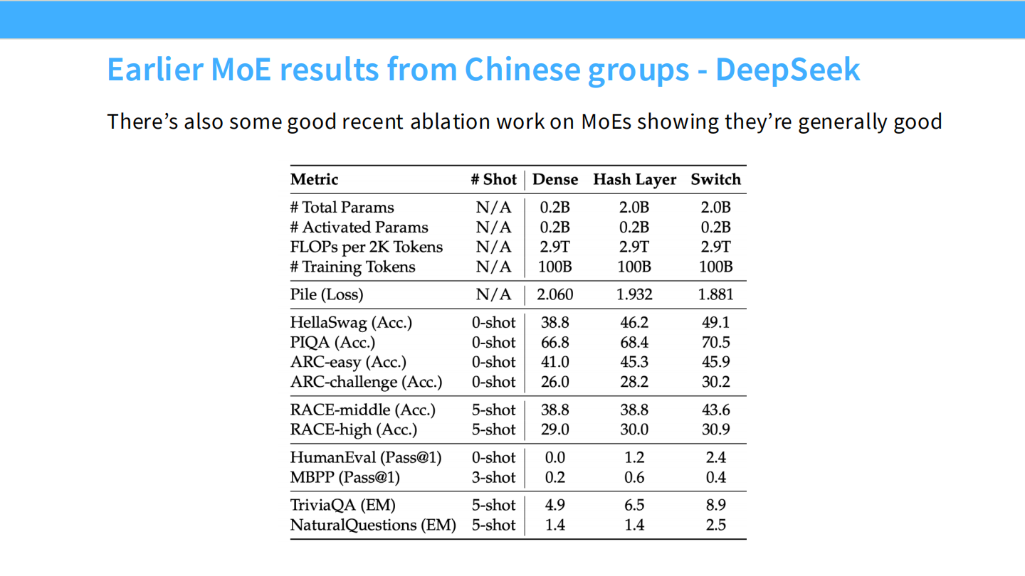 - 结论: 即使是早期的实验也表明,**”They’re generally good”**。只要把 Dense 层换成 MoE 层,在计算量不变的情况下,模型性能就会全面提升。这为后续大规模投入 MoE 提供了理论信心。