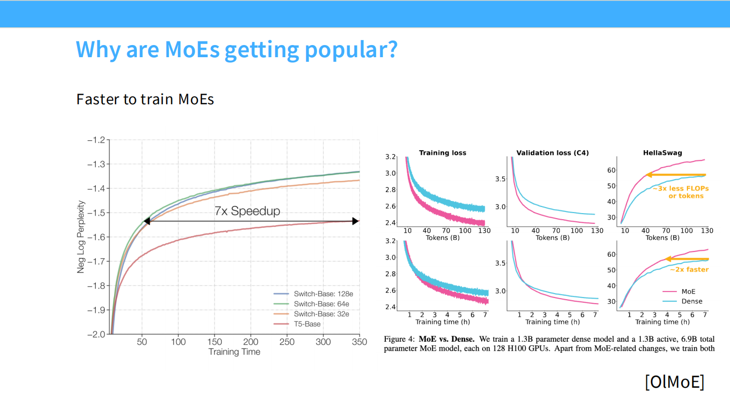 - 右图: 引用 OlMoE 的数据。粉色线 (MoE) 的下降斜率远超蓝色线 (Dense)。标注显示 “~2x faster” (更少 FLOPs 或 tokens 达到同等精度)。