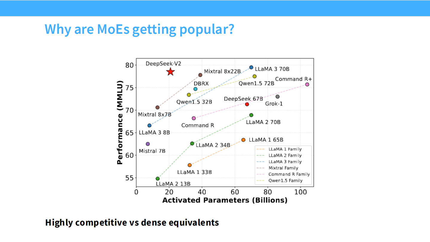 - 关键对比: 注意红色的五角星 DeepSeek-V2。它的激活参数量非常小(约 20B+),但 MMLU 得分却高达 80 左右,超过了 LLaMA 3 70B(稠密模型,激活参数 70B)和 Mixtral 8x22B。