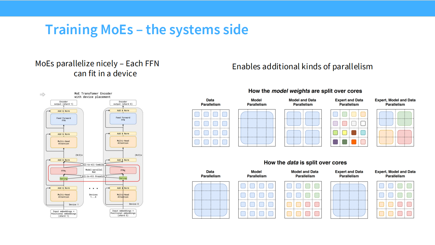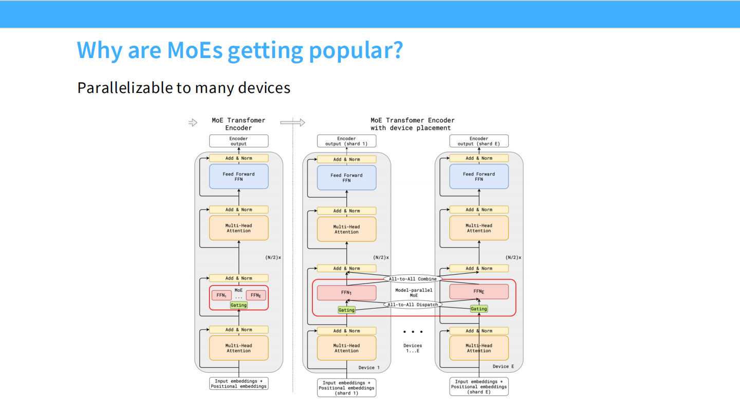 - 并行化 (Parallelizable): MoE 架构非常适合分布式训练。每个 Expert 可以被视为一个独立的计算单元,完美契合多 GPU 集群。