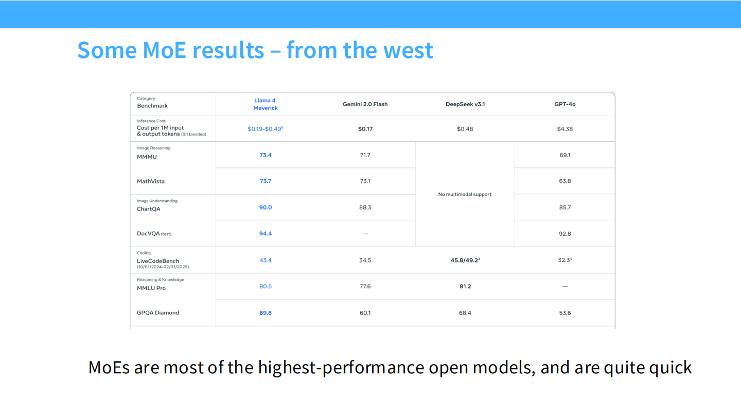 - 优势: “Quite quick” —— 它们不仅强,而且快。DeepSeek V3 证明了极致优化的 MoE 可以比闭源模型便宜非常多。