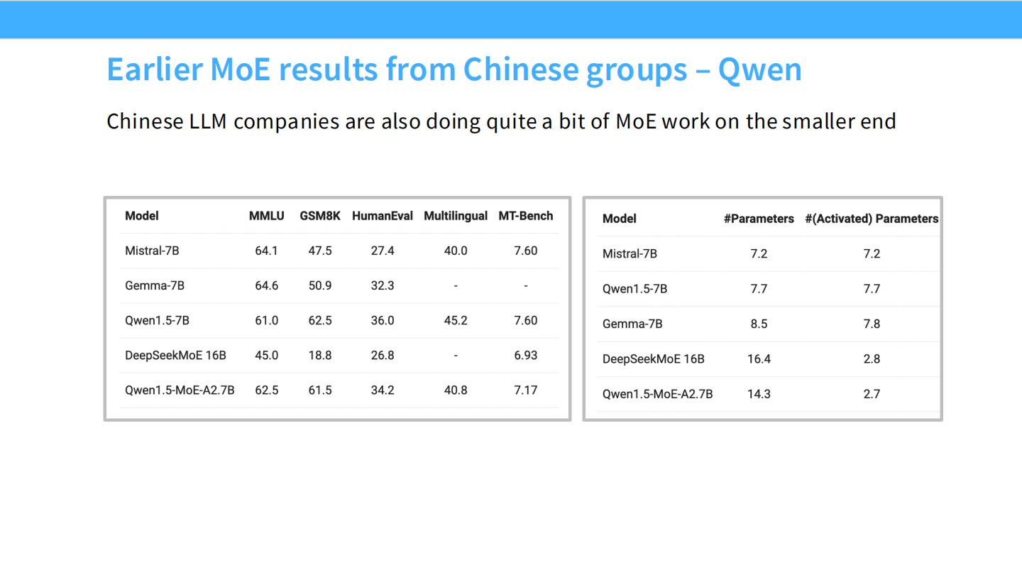 - 右表 (参数): Qwen1.5-MoE-A2.7B 的总参数是 14.3B,但 #Activated Parameters 仅为 2.7B。DeepSeekMoE 16B 的激活参数仅为 2.8B。