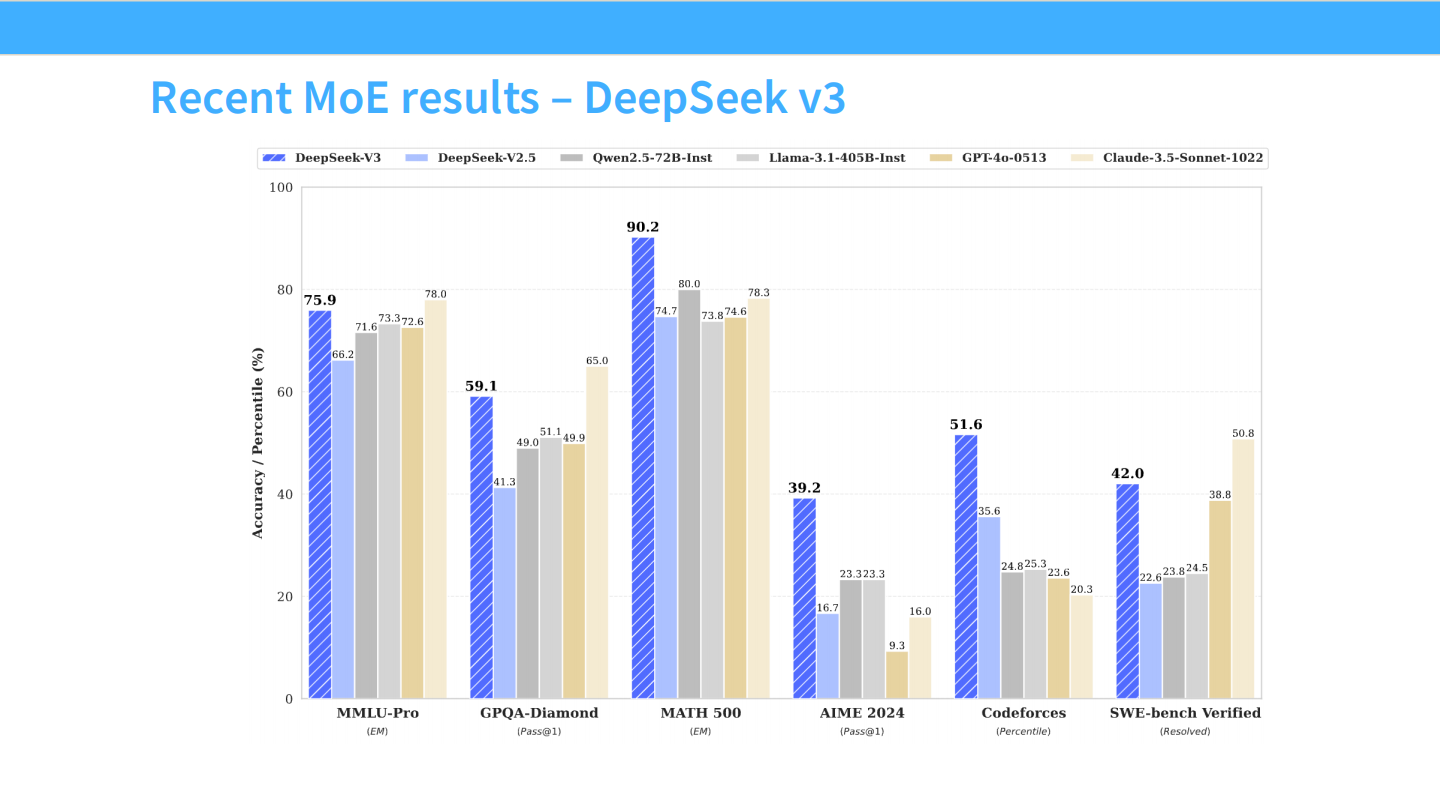 - SOTA 性能: DeepSeek V3 的发布是一个里程碑,证明了开源 MoE 模型可以在数学、代码等最考验逻辑推理的任务上,击败最强的闭源模型。