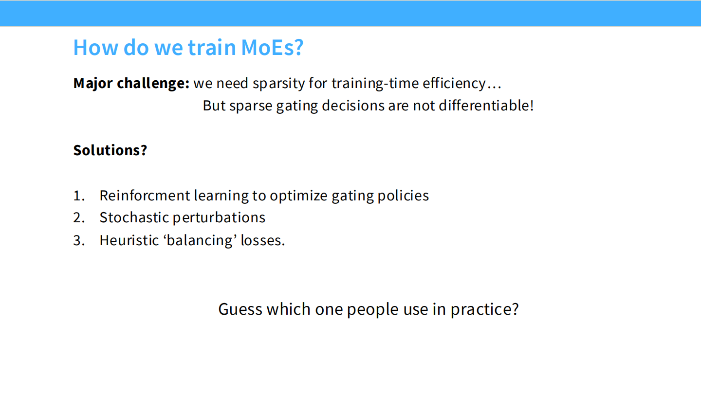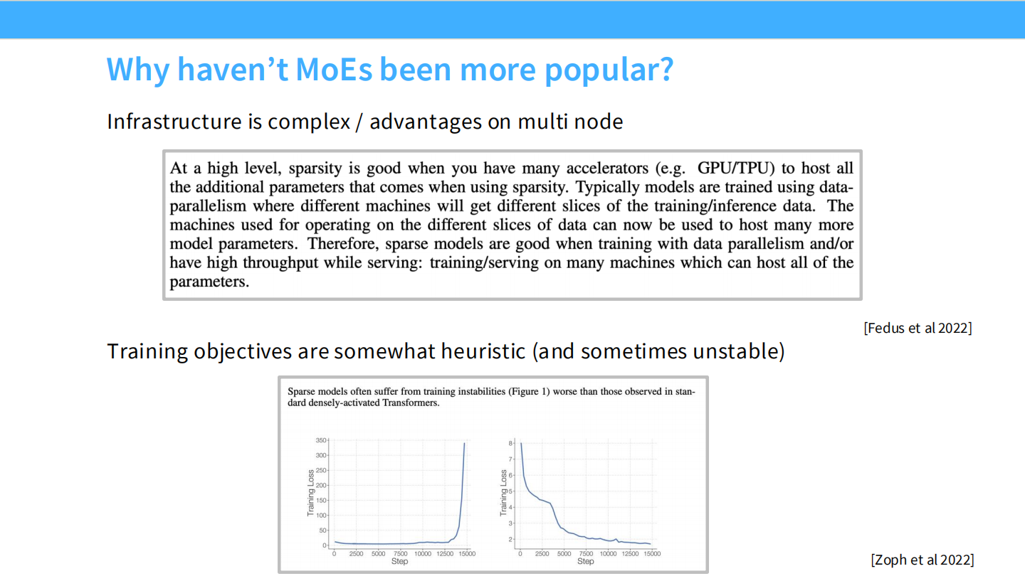 - 上图(文本): 摘录解释了稀疏性带来的基础设施挑战(需要 host many parameters, data parallelism, different machines…)。