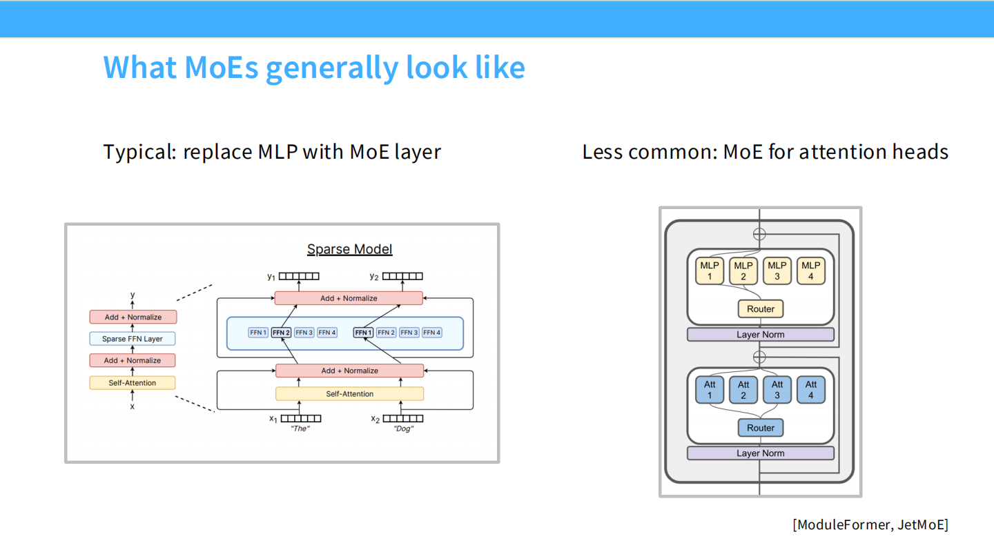 - 右图 (Less common): 引用了 [ModuleFormer, JetMoE]。这种架构试图把 Attention 层也做成 MoE(每个 Head 也是专家),但这并不常见。