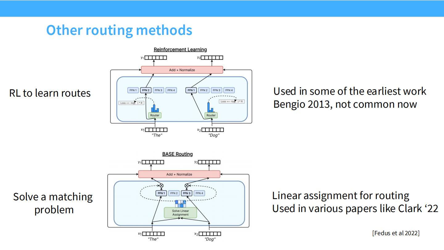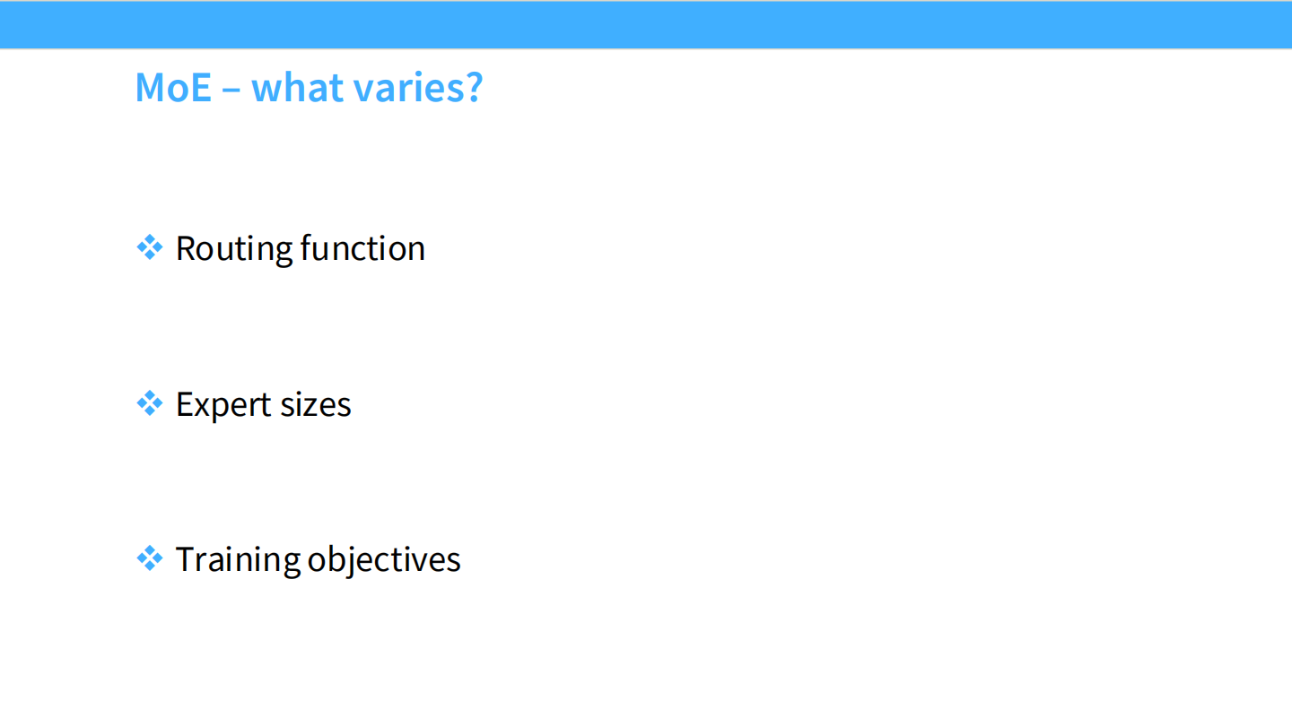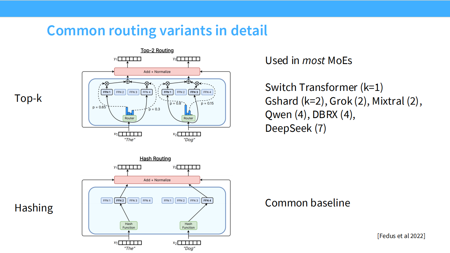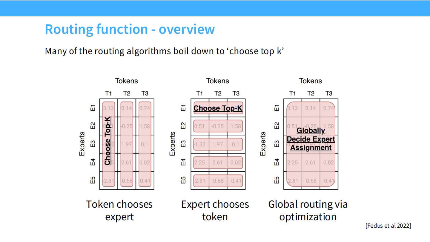 - Routing function (路由函数): 怎么选专家?(Top-k, Hash, RL…)